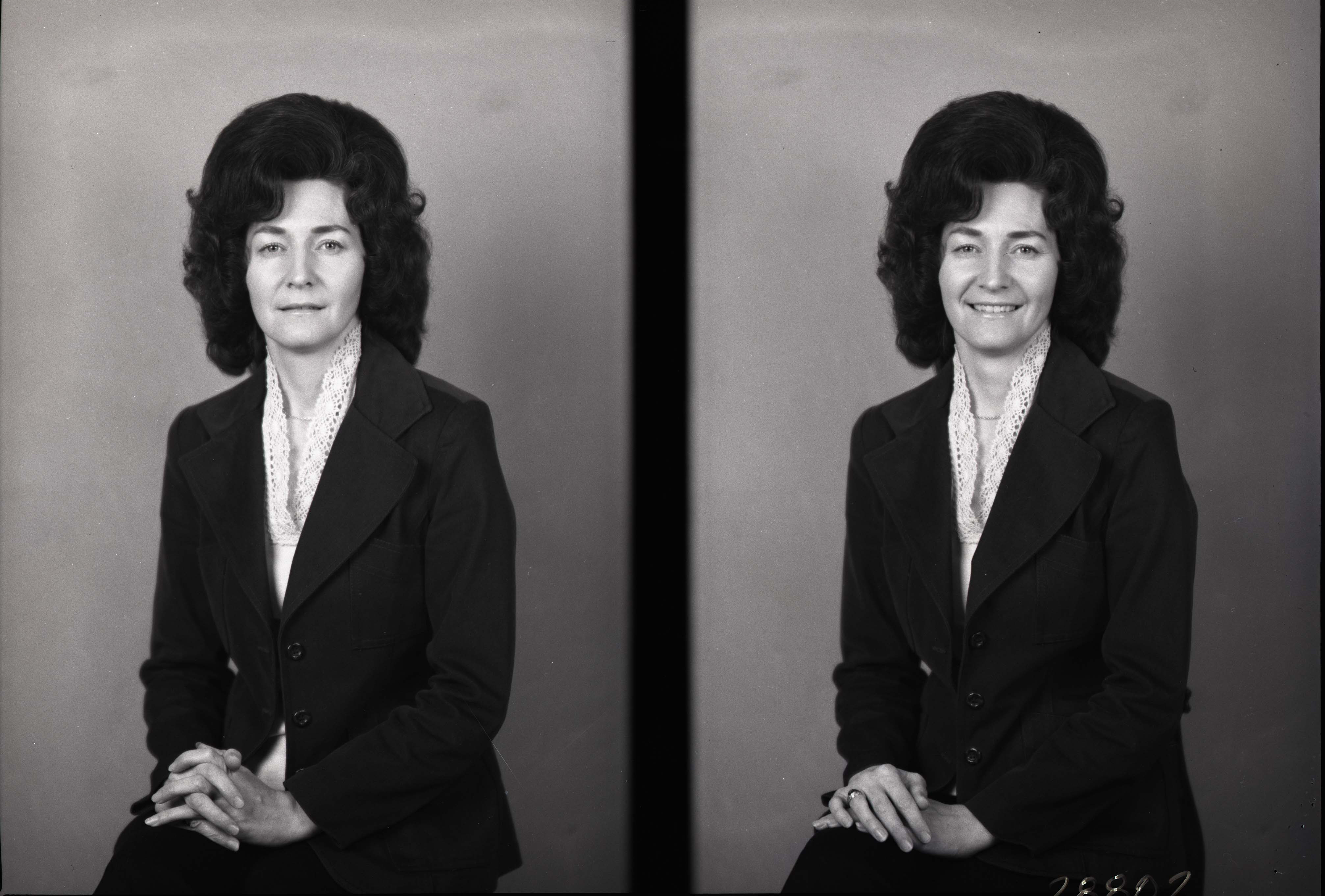 Photo of two separate photographs of Margie Katheryn (Kibler) Day with styled hair and wearing a jacket over a blouse trimmed with lace.