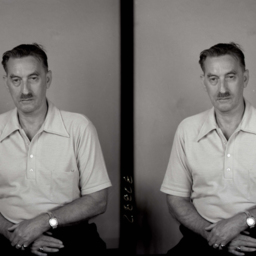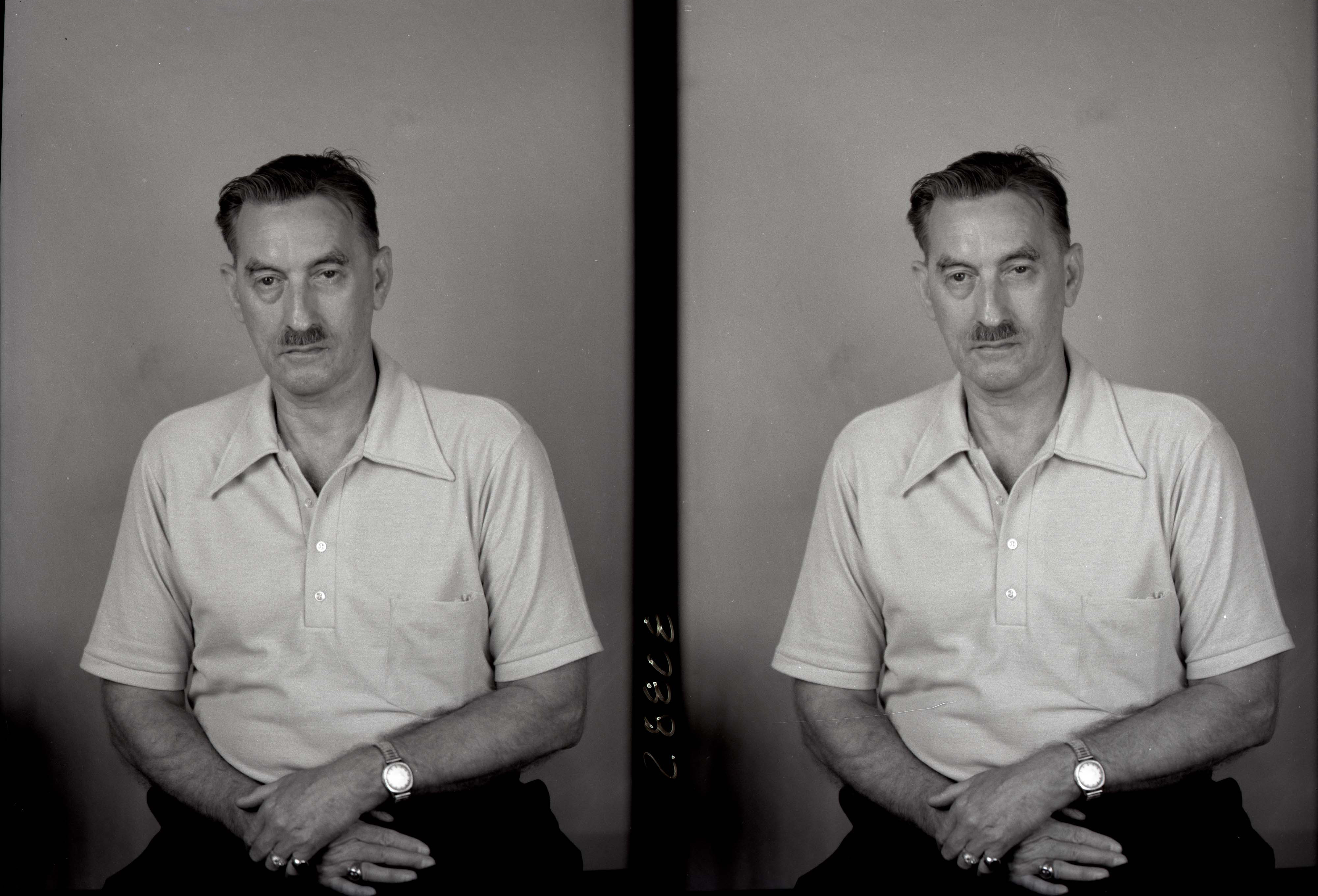Photo of two separate portrait photographs of the same unidentified man with a mustache and wearing a short-sleeved, collared shirt.