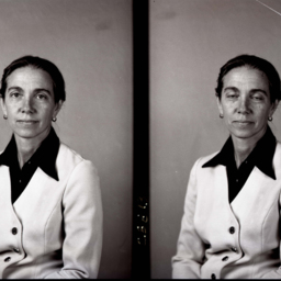 Photo of two separate portrait photographs of the same unidentified woman with her hair pulled back and wearing earring with her outfit.