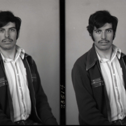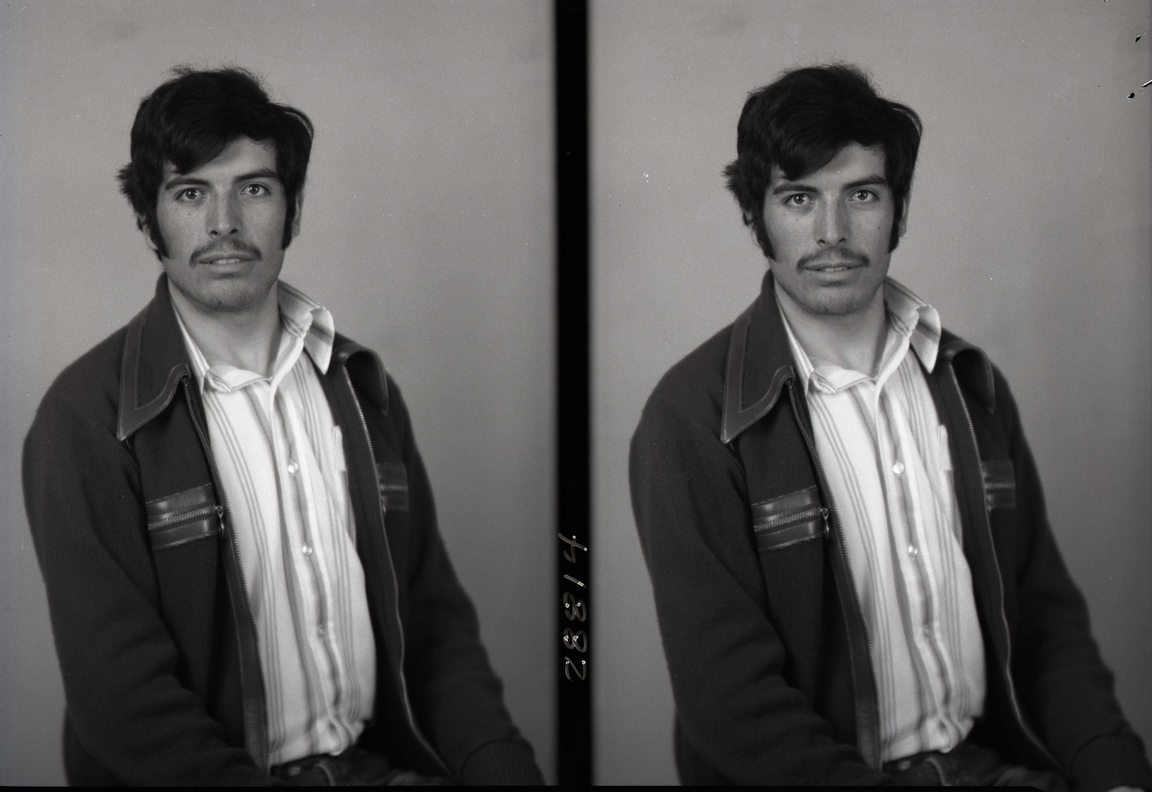 Photo of two separate portrait photographs of the same unidentified young man with a mustache wearing a striped shirt.