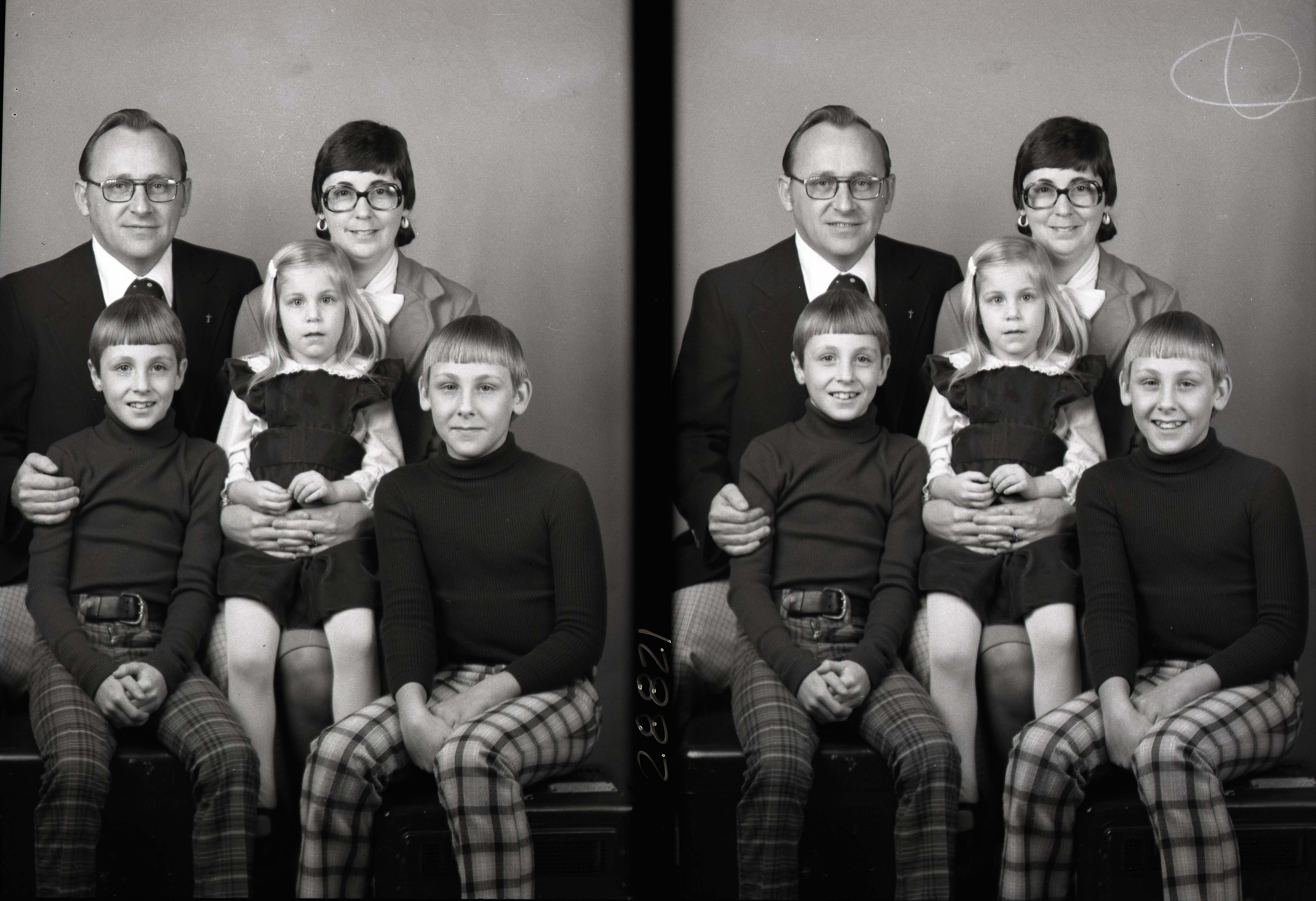 Photo of two separate photographs of the same unidentified man, woman, girl and two boys posed together. Both boys have bangs and are wearing plaid pants.