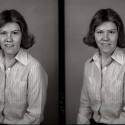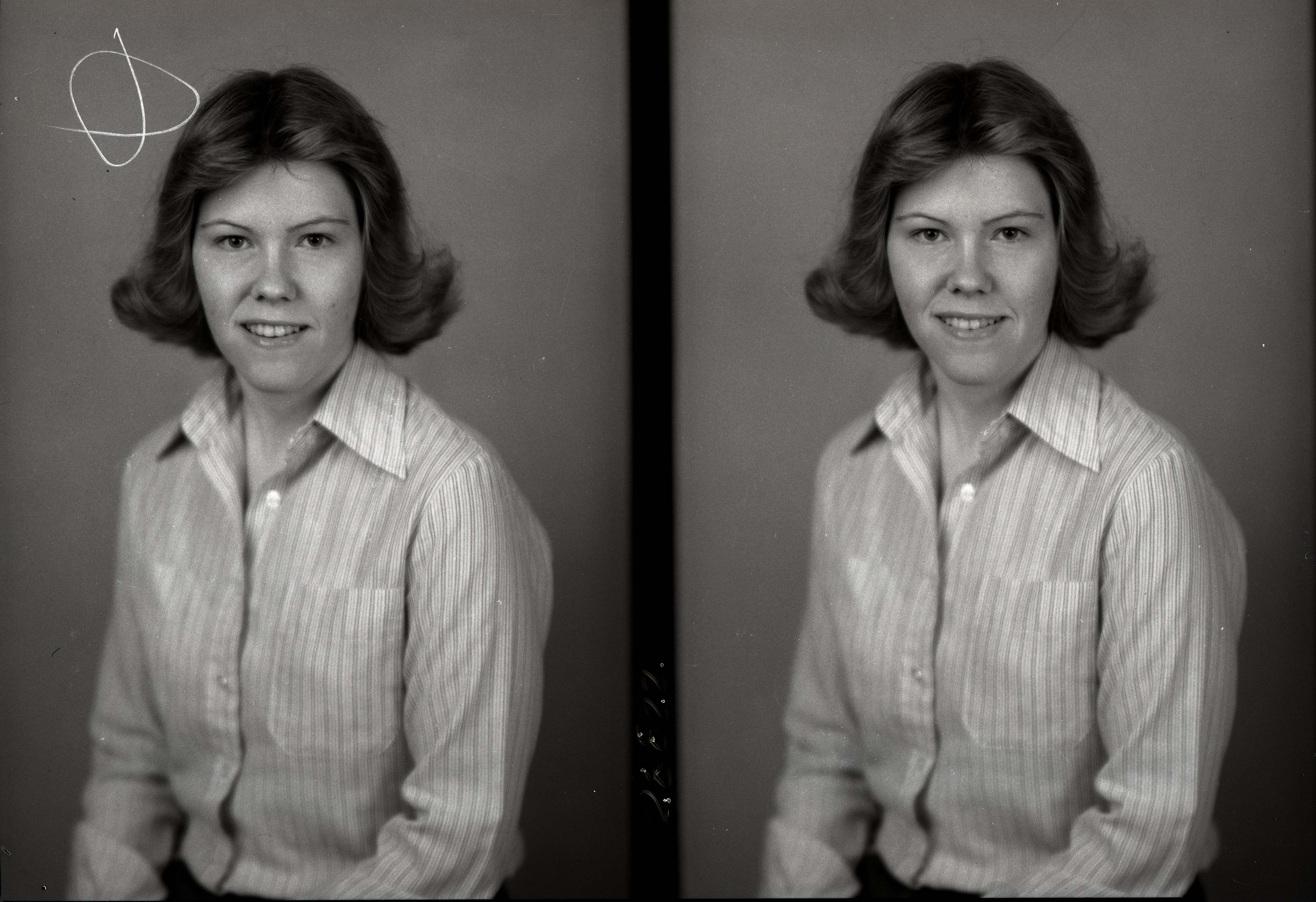 Photo of two separate portrait photographs of the same unidentified young woman with short hair parted in the middle and curled outwards. She is wearing a striped blouse.
