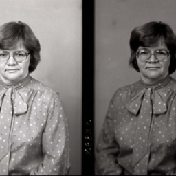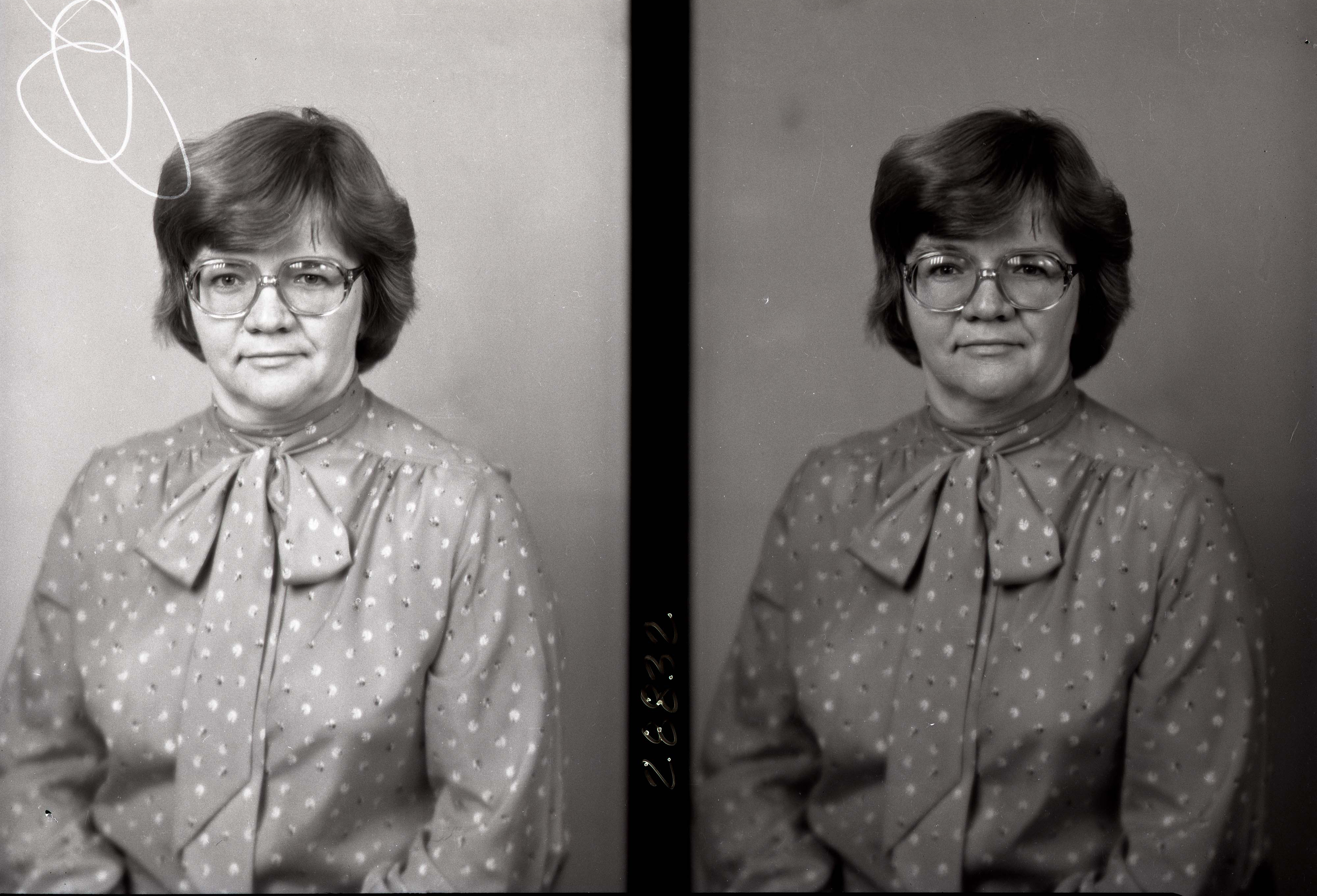 Photo of two separate portrait photographs of the same unidentified woman with short hair, glasses, and wearing a print blouse with a bow in the front.