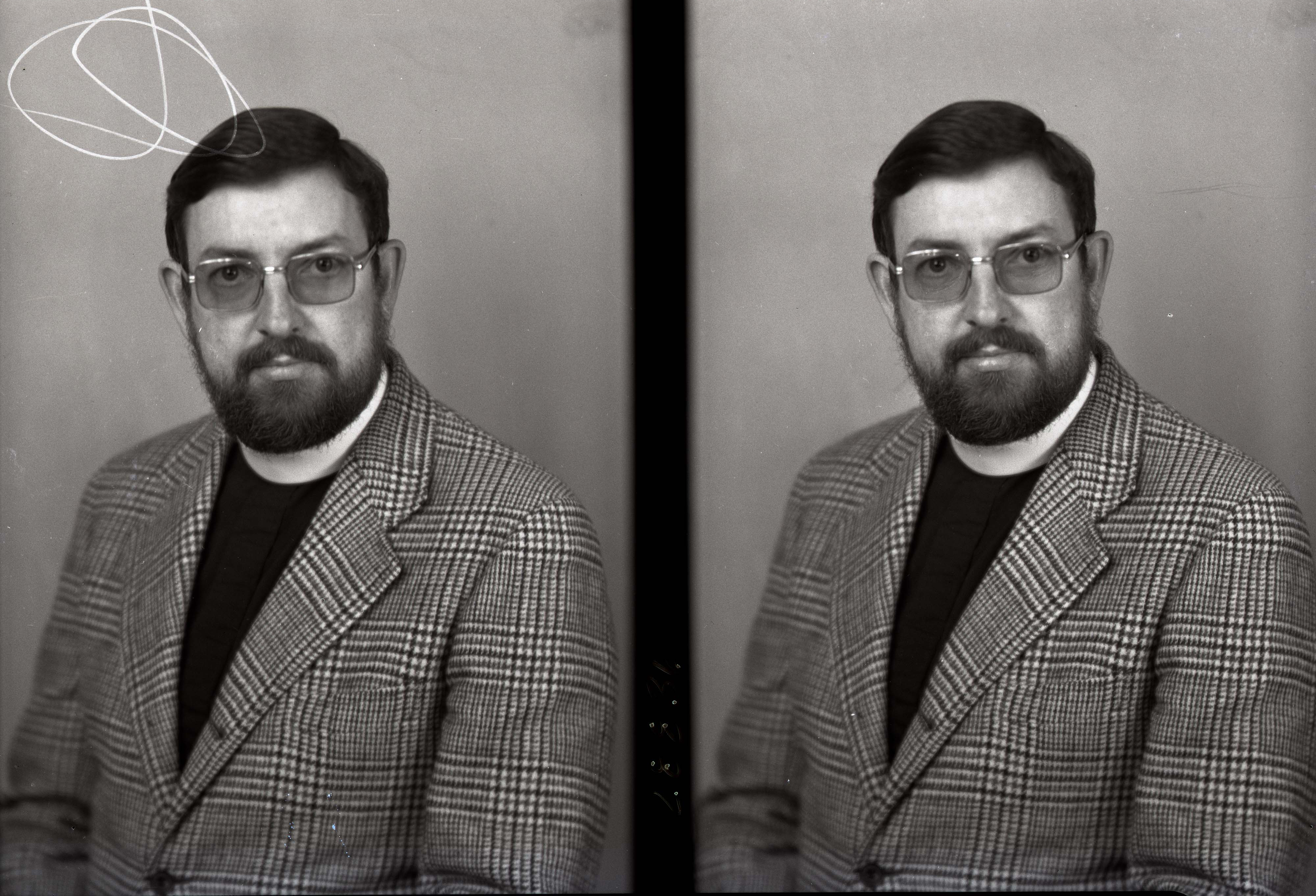 Photo of two separate portrait photographs of the same unidentified man with glasses, a beard and a mustache. He is wearing a clerical collar with his plaid jacket.