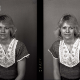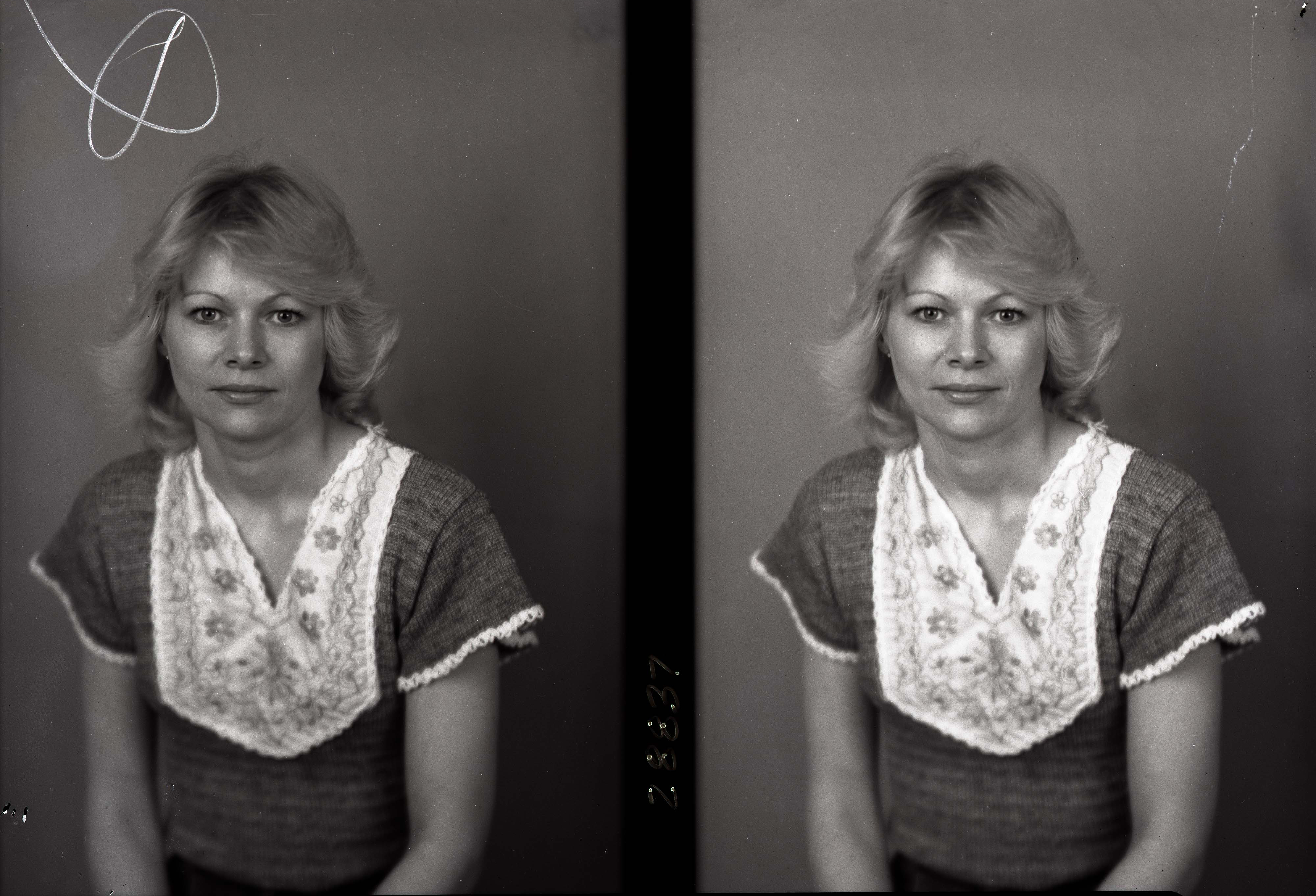 Photo of two separate photographs of the same unidentified young woman with short hair and wearing a short-sleeved top.