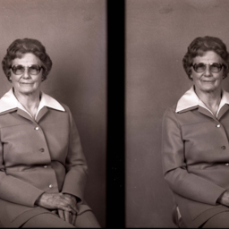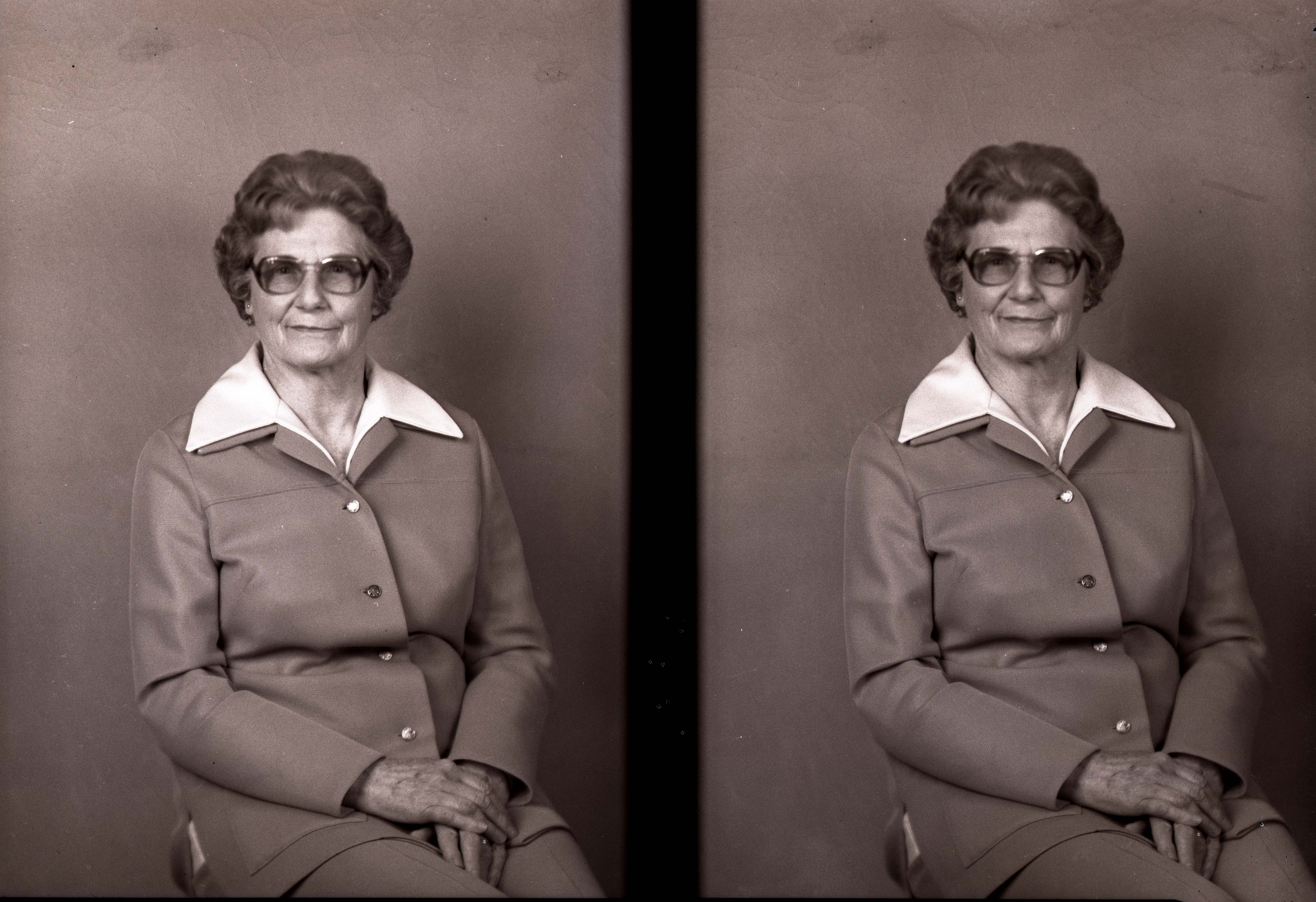 Photo of two separate portrait photographs of the same unidentified woman with short hair, glasses, and wearing a blouse with a wide collar over her jacket.