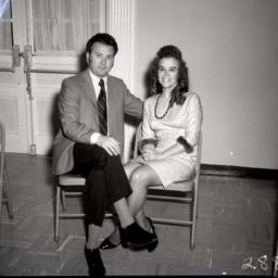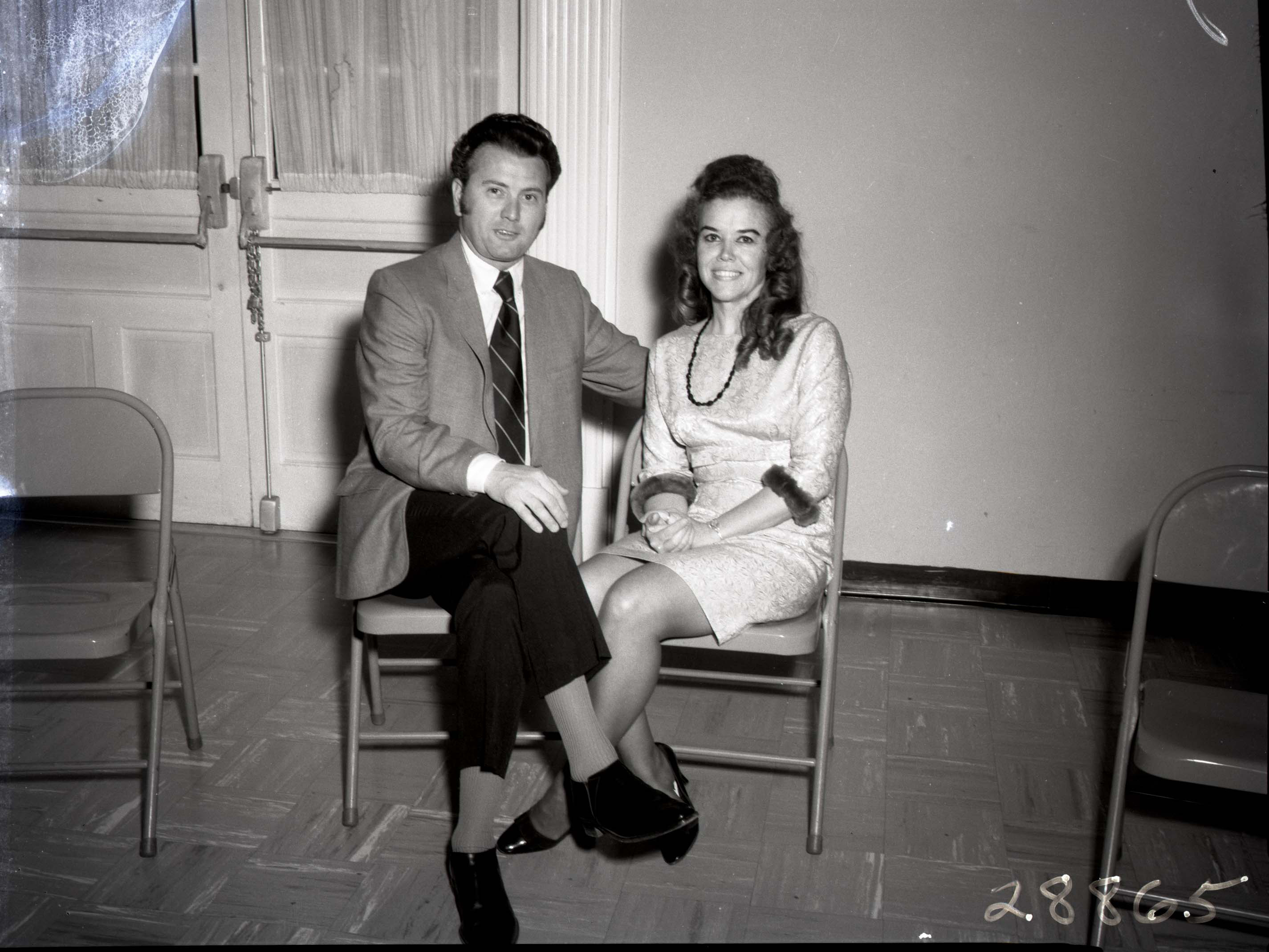 Unidentified man and woman sitting on metal folding chairs in a large room.