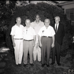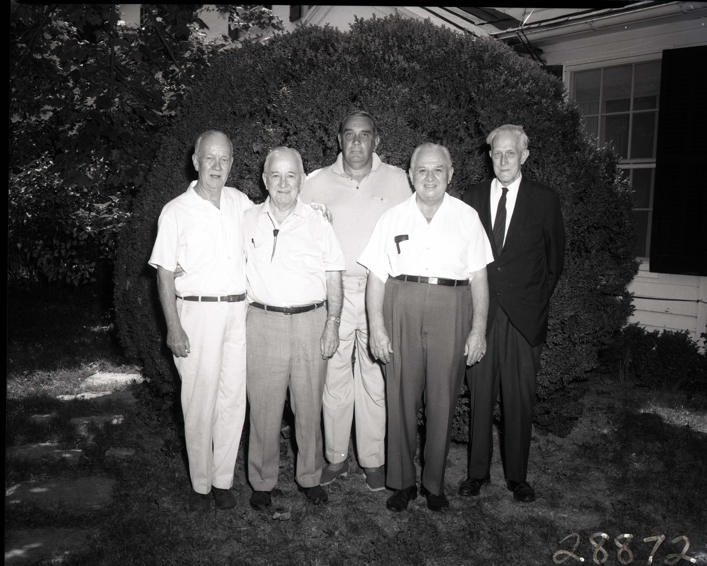 Unidentified group of five men are standing together outdoors. A large bush and house is behind them.