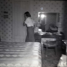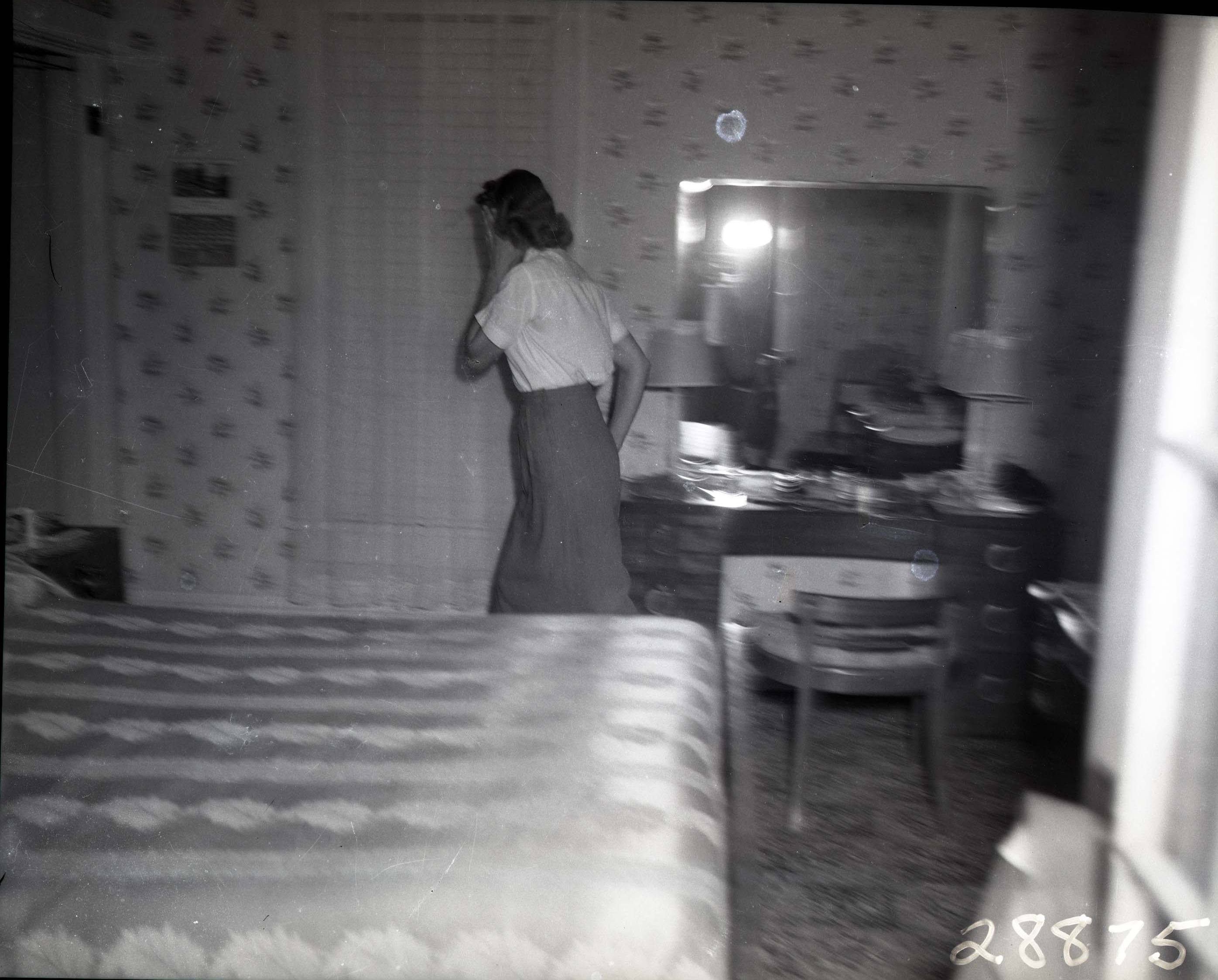 Photograph of an unidentified woman with her hand covering her face and walking to the far side of a wall-papered bedroom.