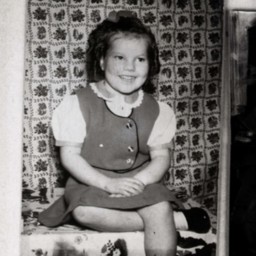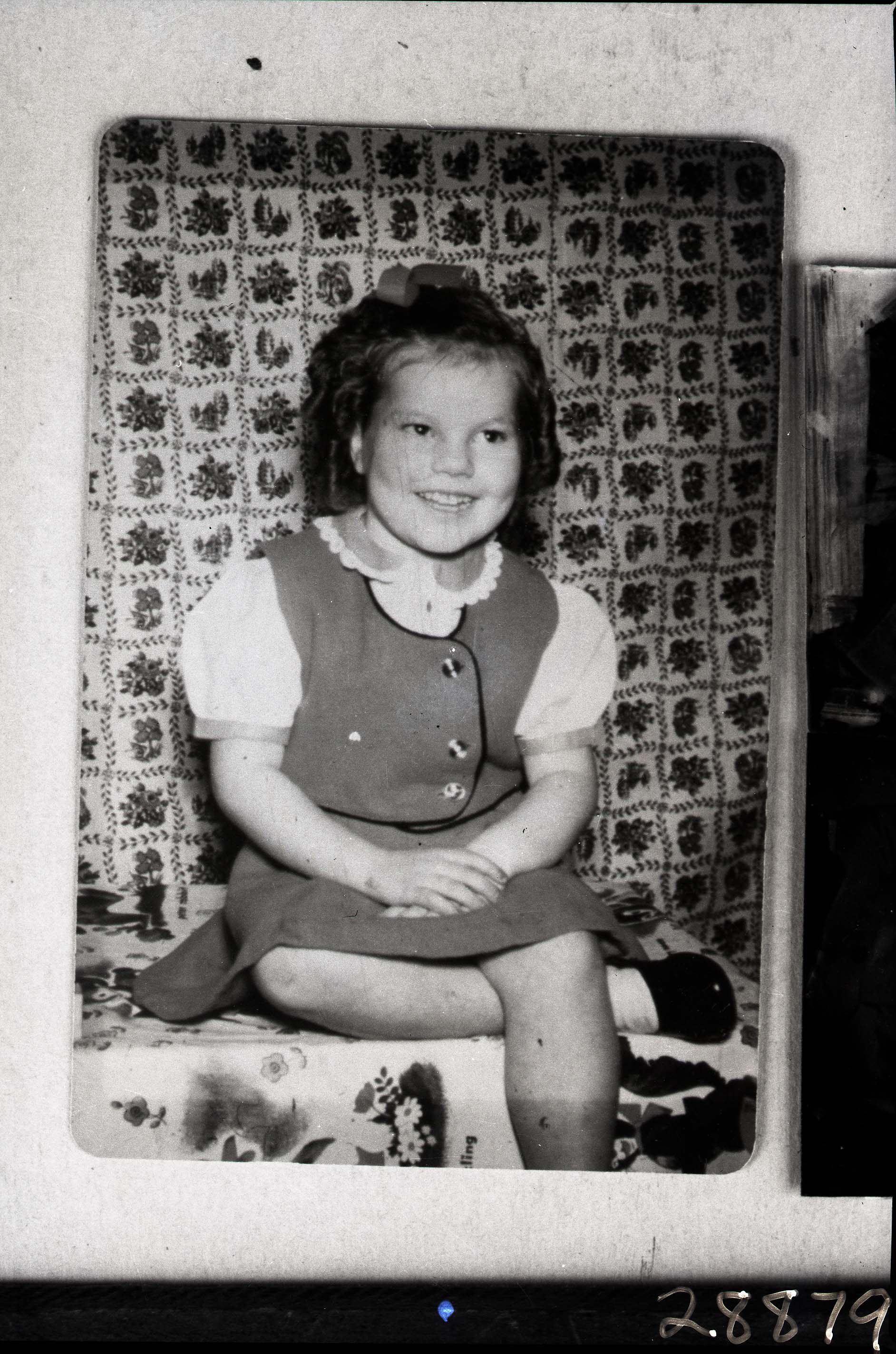 Photo of a photograph of an unidentified young girl with a bow in her short hair and seated on a covered surface with one leg under the other and her hands in her lap.