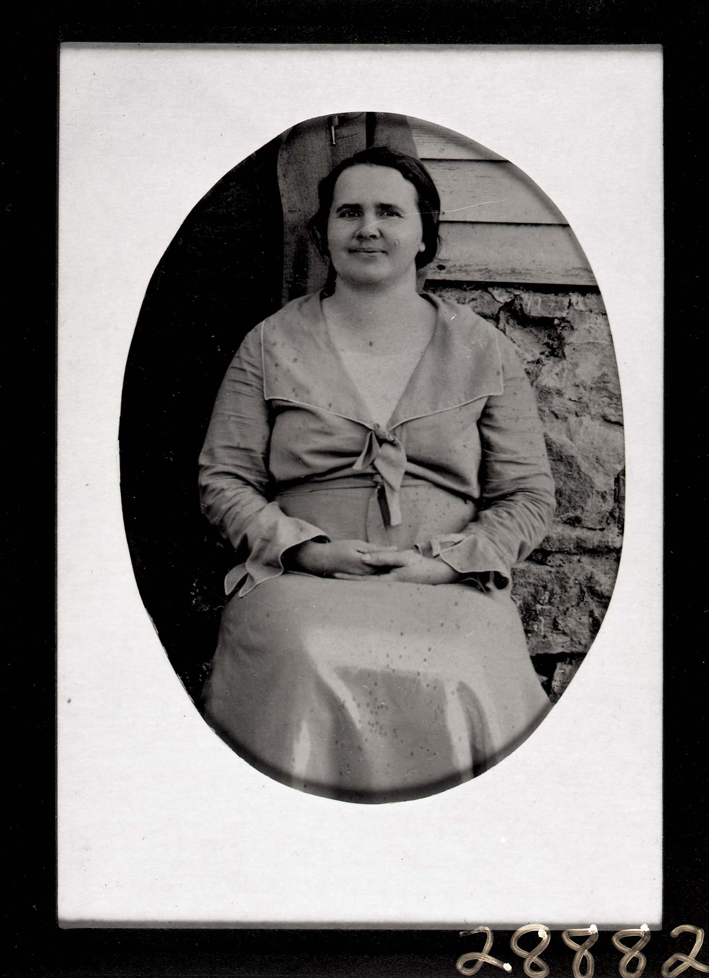 Photo of an oval-framed photograph of an unidentified woman with a bow on the front of her V-necked dress.