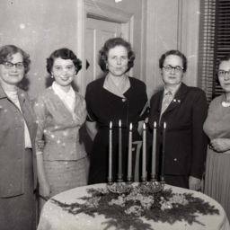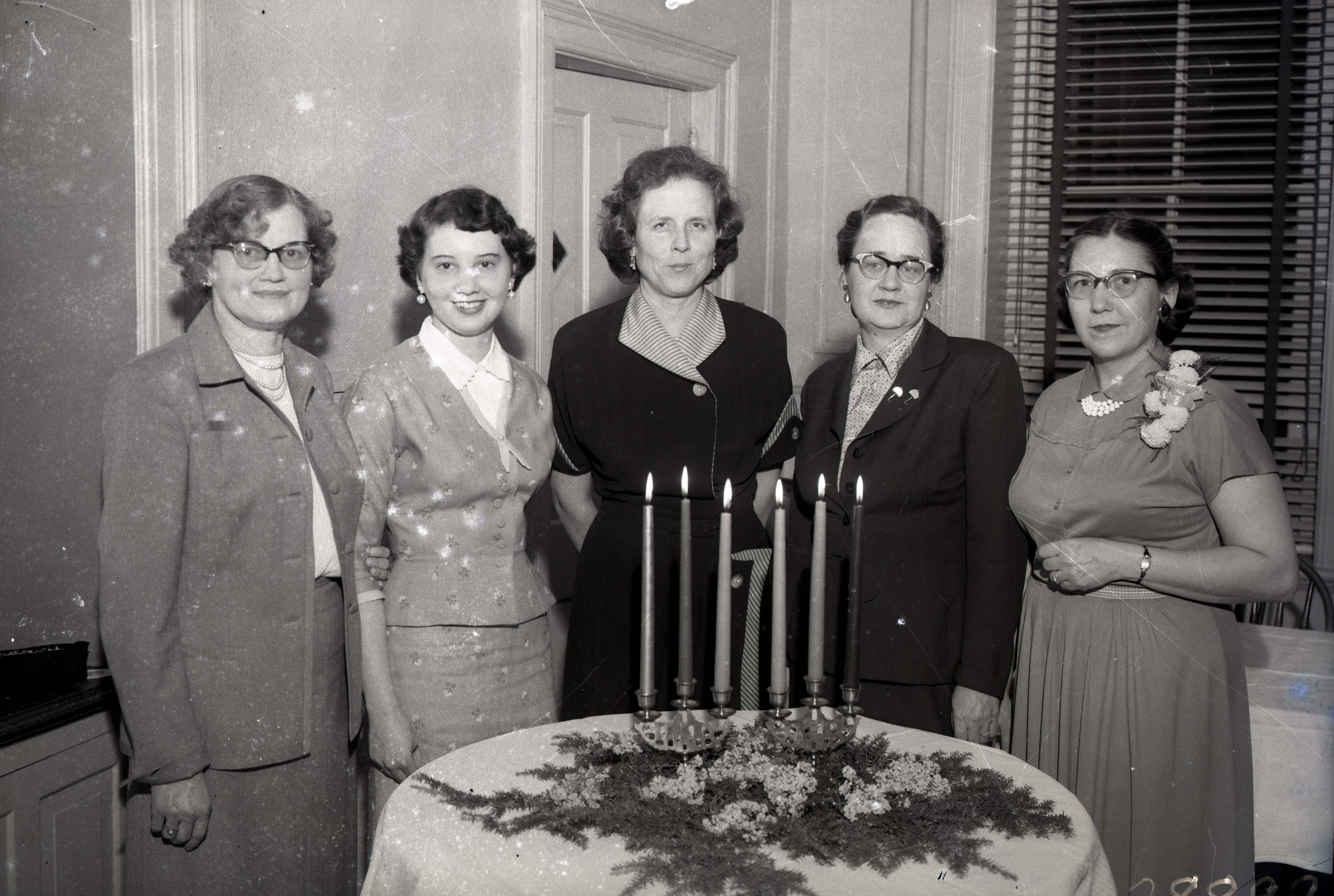 Five unidentified women are standing together behind a table with six lit candles and a floral decoration on it.