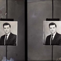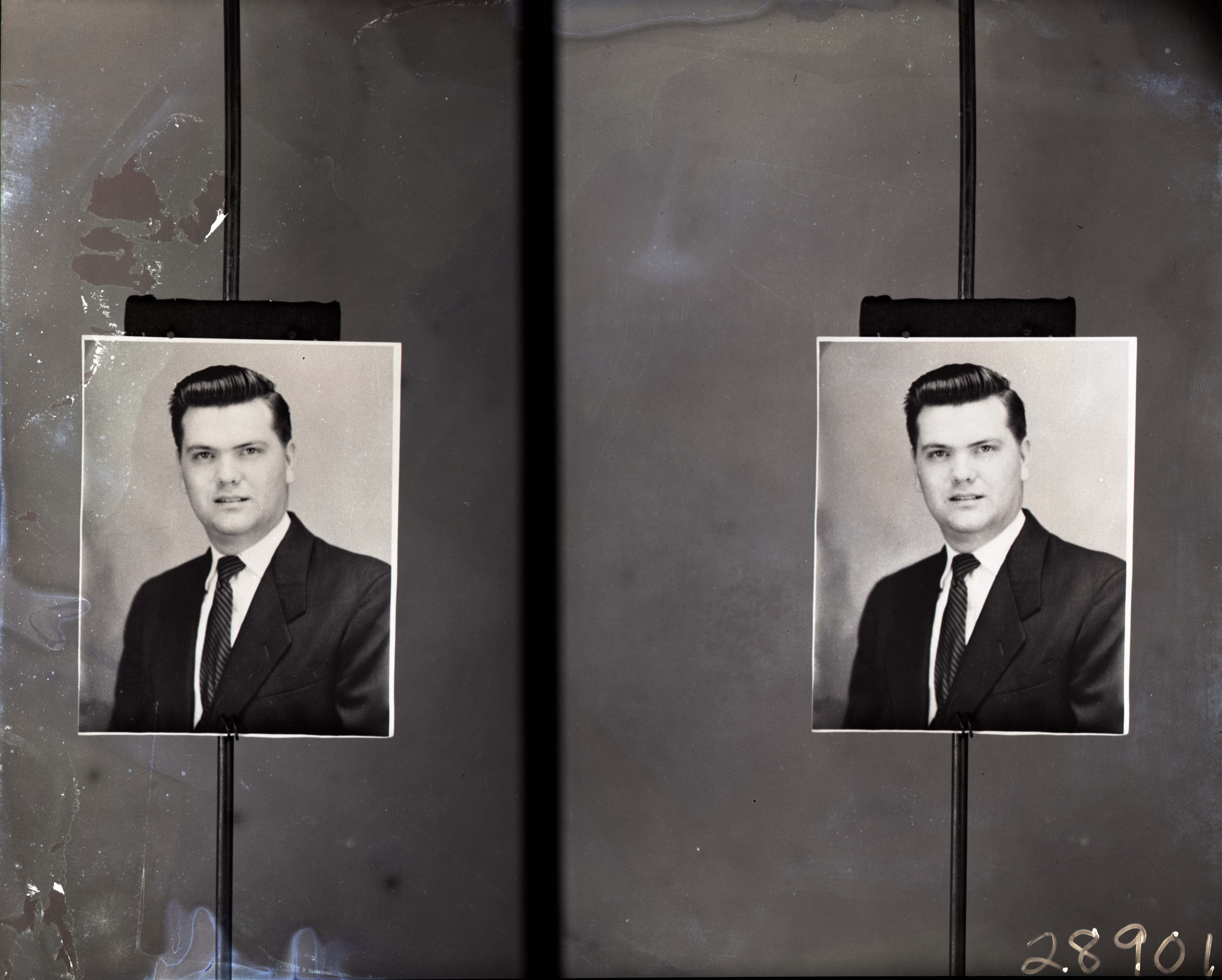 Photo of two separate portrait photographs of the same unidentified young man in a suit and tie.