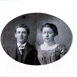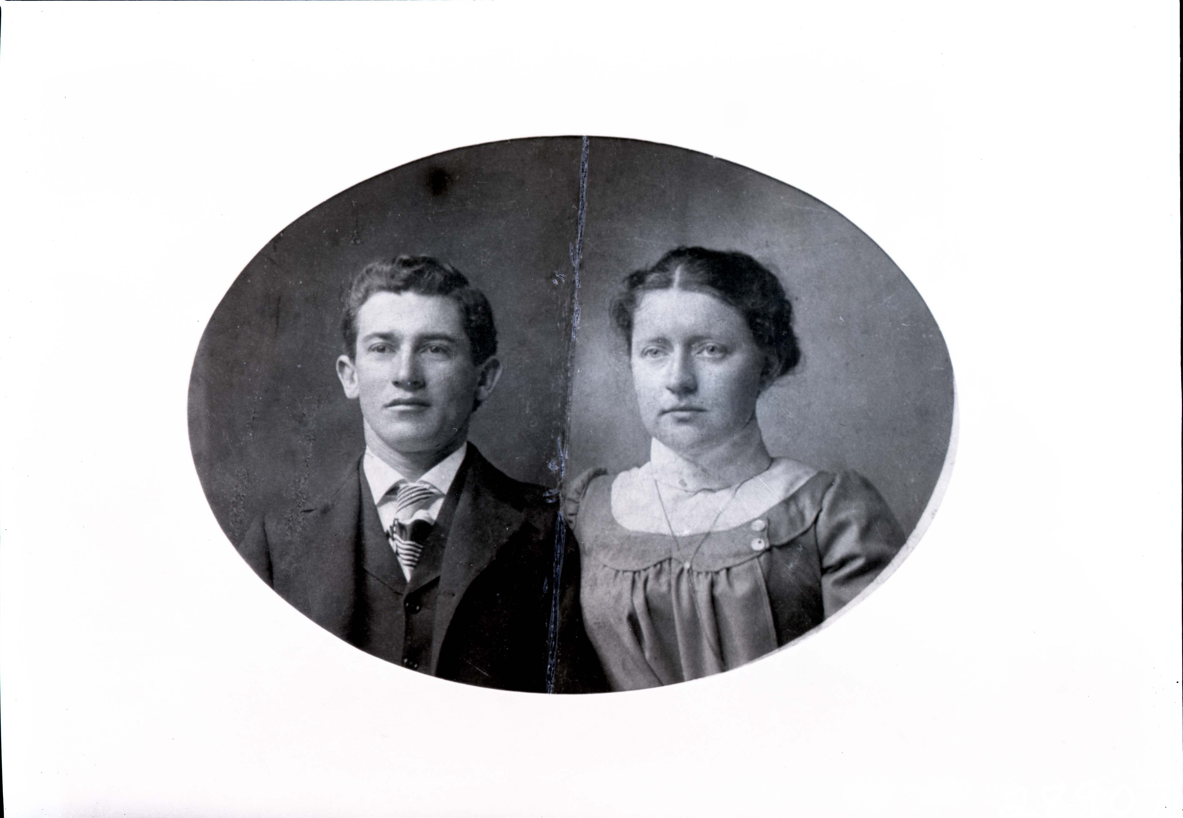Photo of an oval-framed portrait photograph of an unidentified man and woman together.
