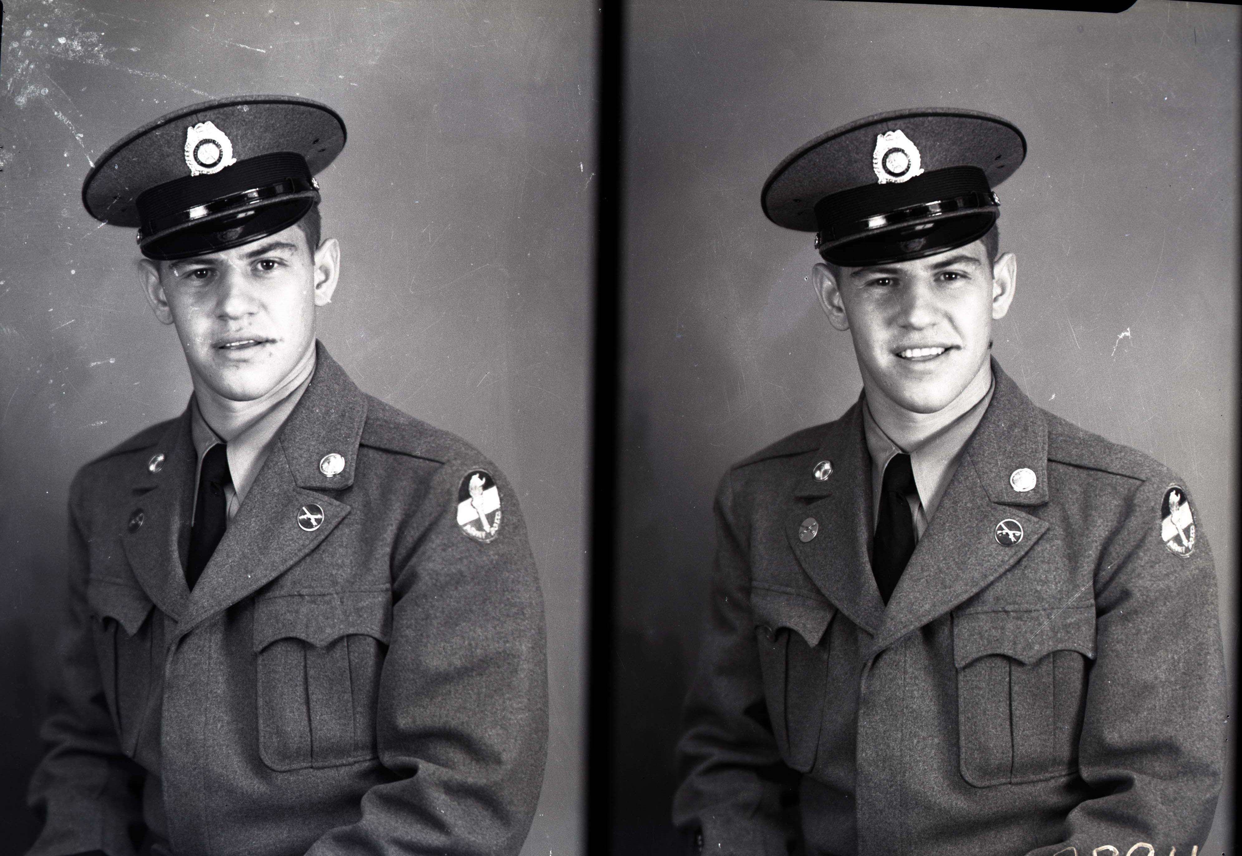 Photo of two separate portrait photographs of the same unidentified cadet from Massanutten Military Academy (MMA). The patch on his shoulder indicates he was a member of the Army ROTC.