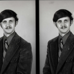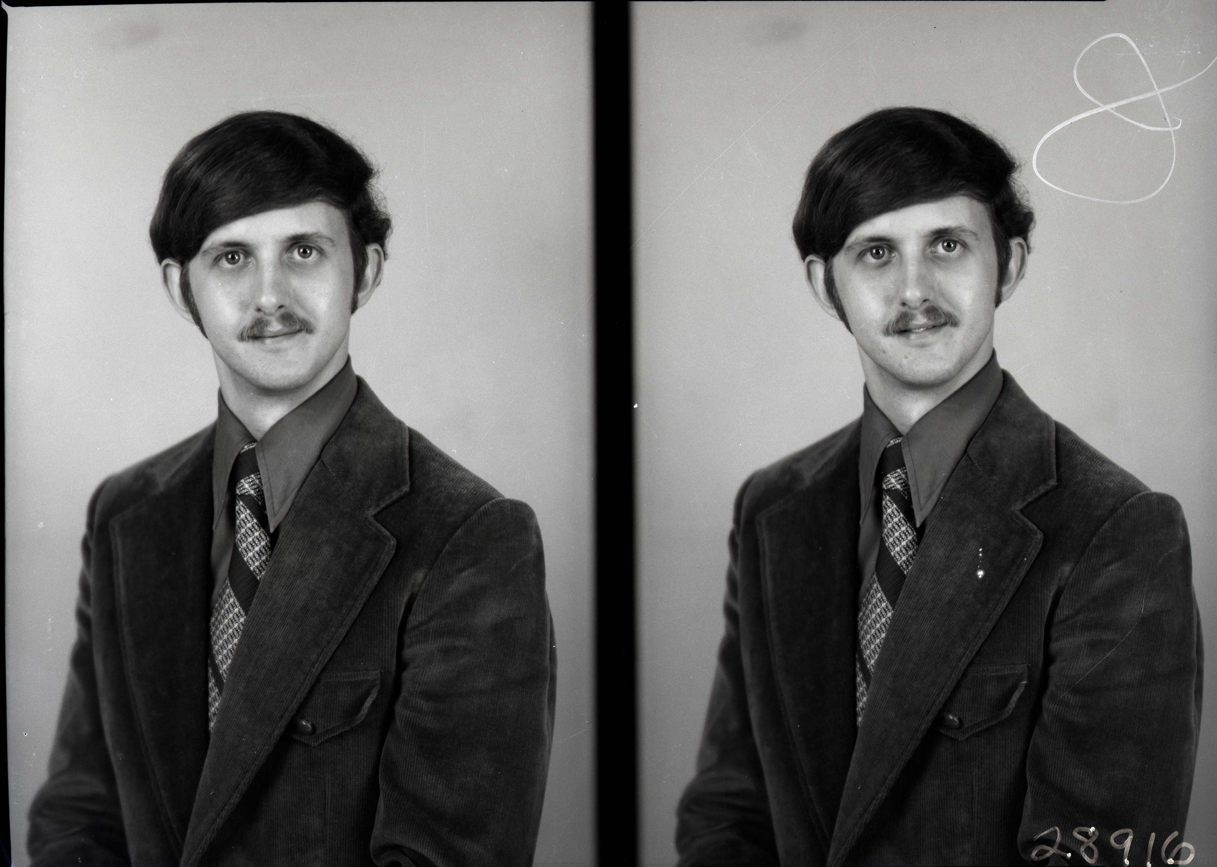 Photo of two separate portrait photographs of the same unidentified young man with a mustache and wearing a suit and tie.