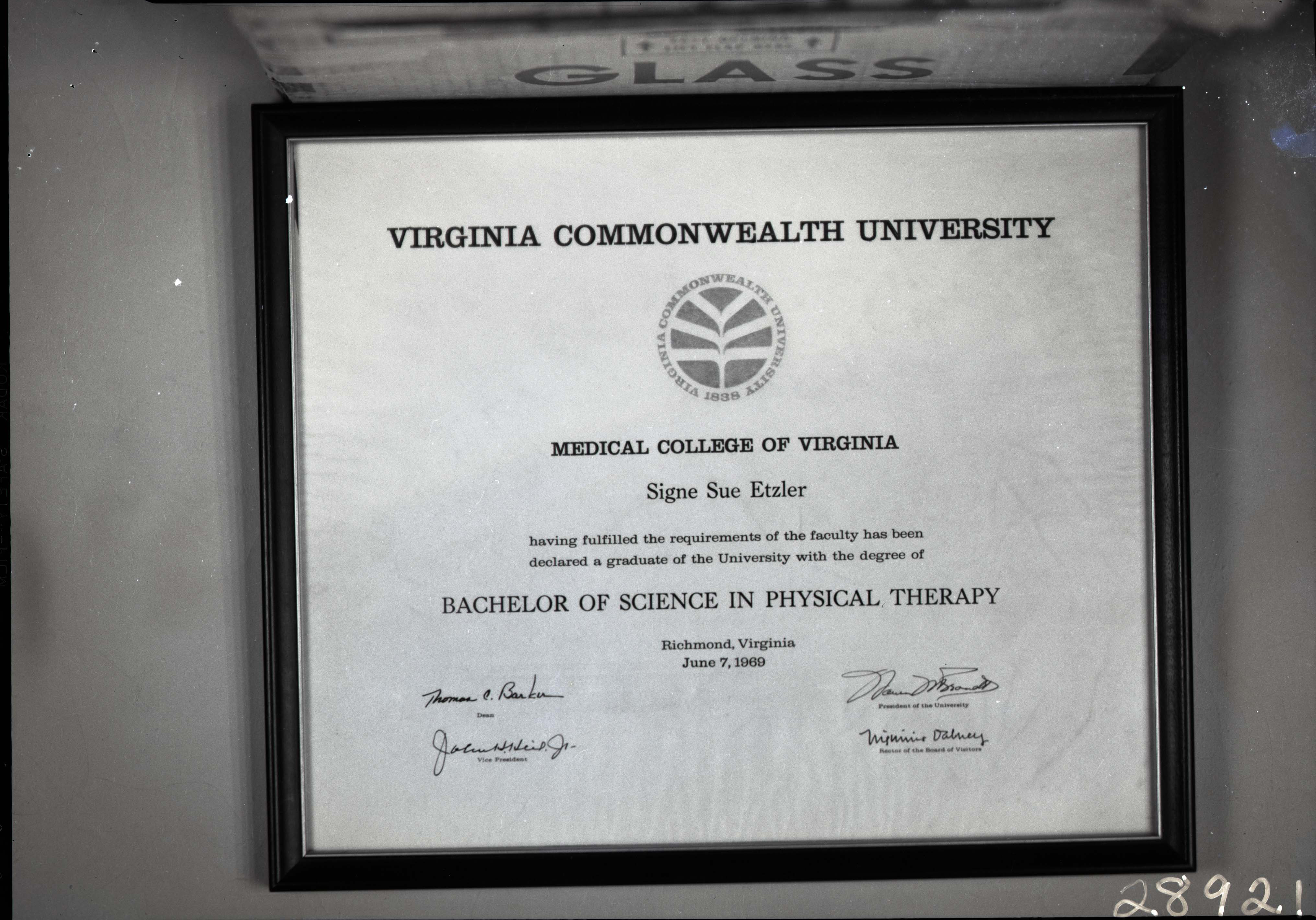 Photograph of the Bachelor of Science (B.S.) degree awarded in 1969 by the Medical College of the Virginia Commonwealth University in Richmond, Virginia, to Signe Sue Etzler.