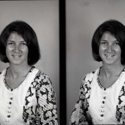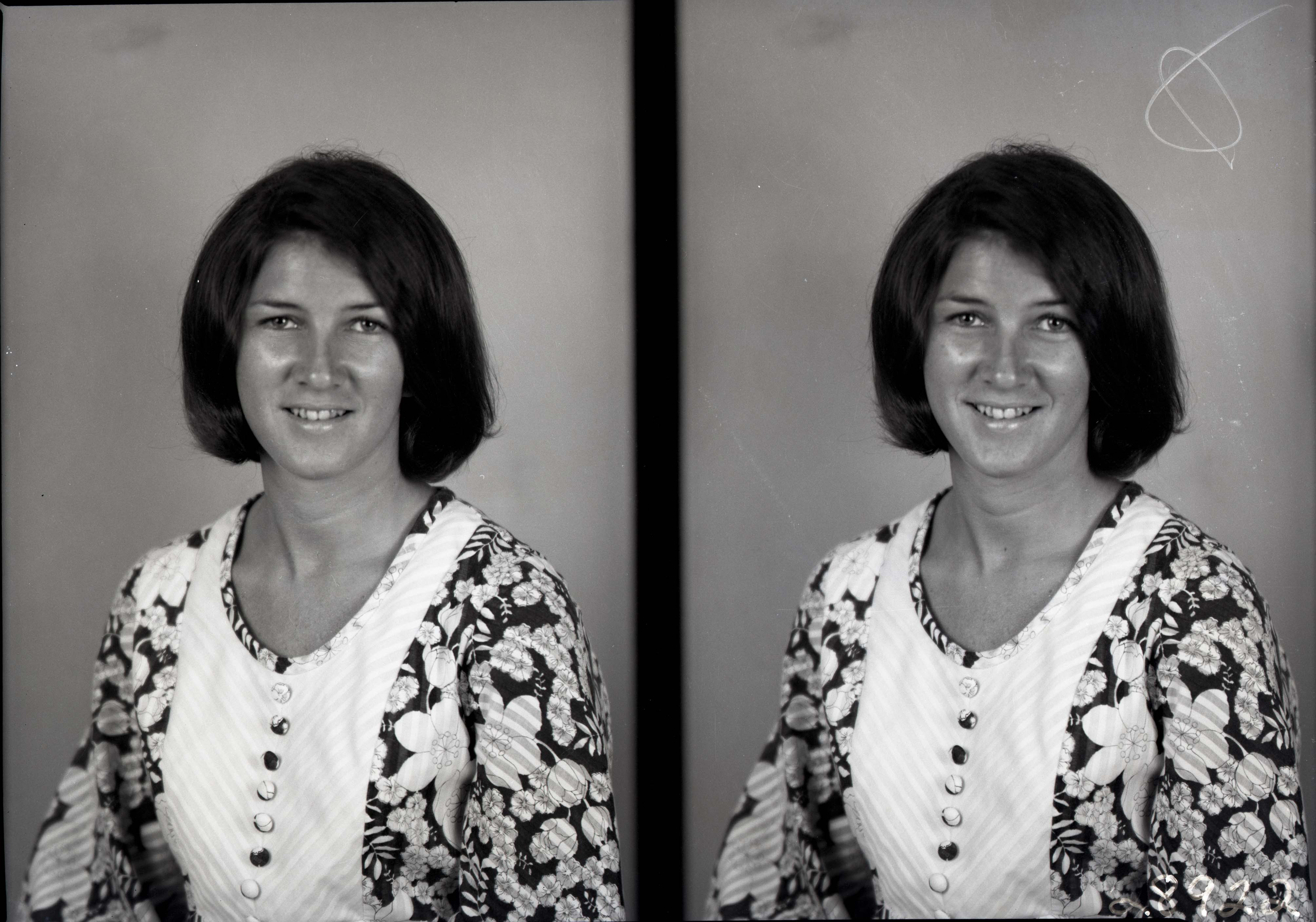 Photo of two separate portrait photographs of the same unidentified woman with short hair and wearing a dress with cloth buttons down the front.
