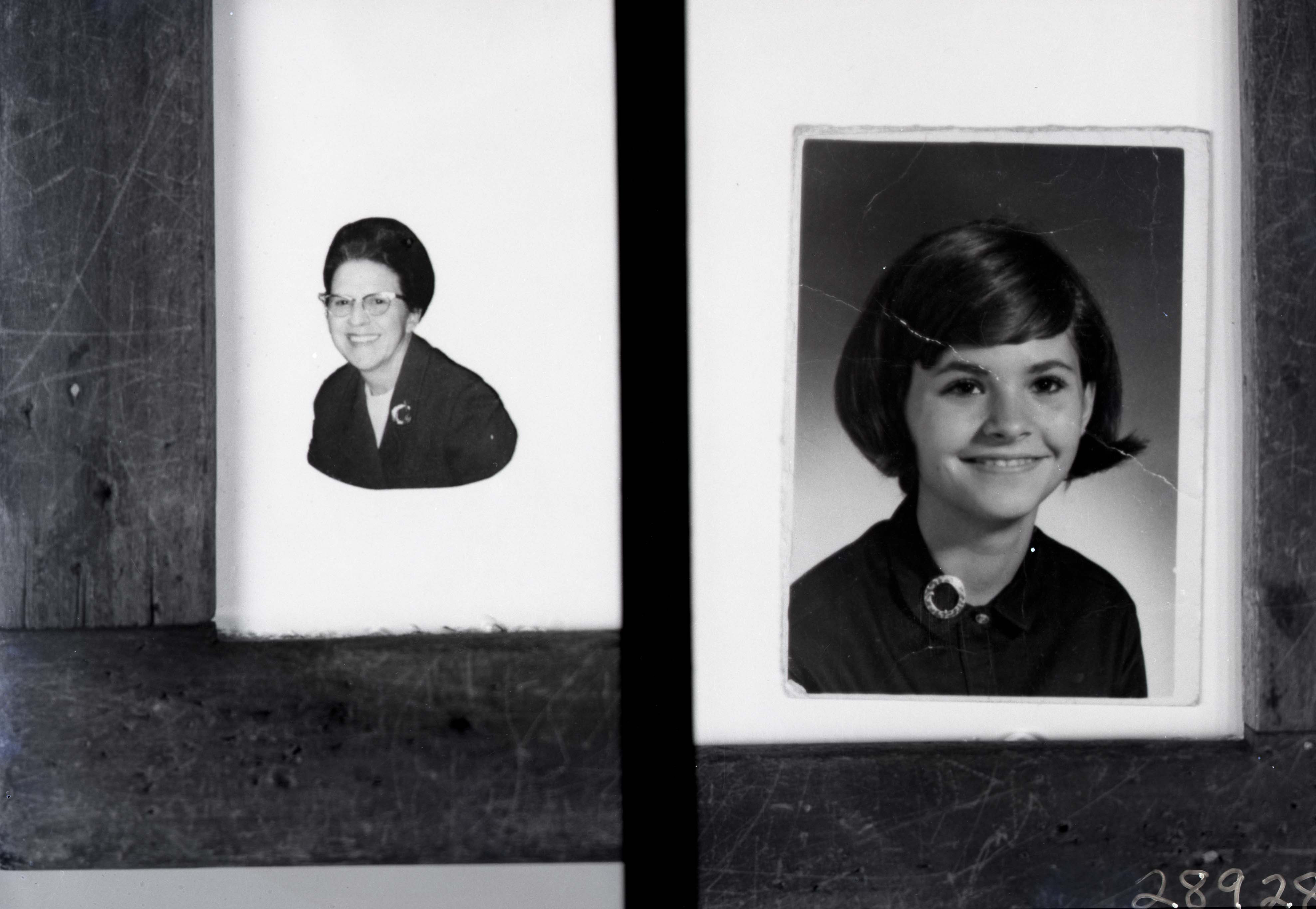 Photo of two separate framed portrait photographs, an unidentified woman with glasses and a girl with short hair and a round pin on her dress.