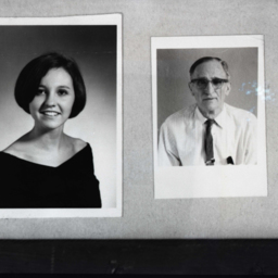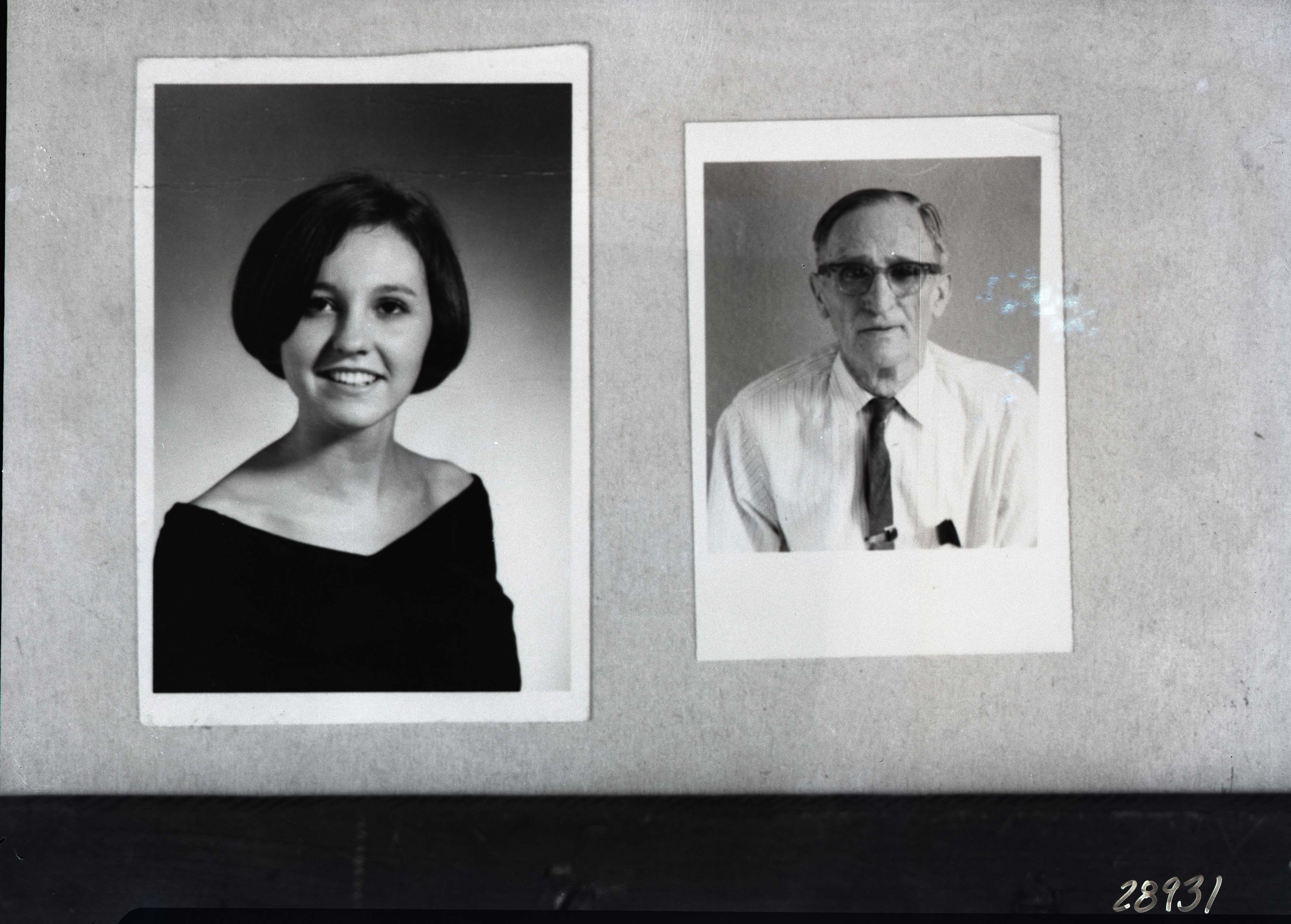 Photo of two separate portrait photographs of unidentified people, a young woman (left) and a man with glasses and a tie (right).