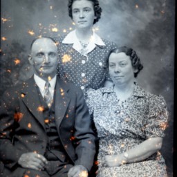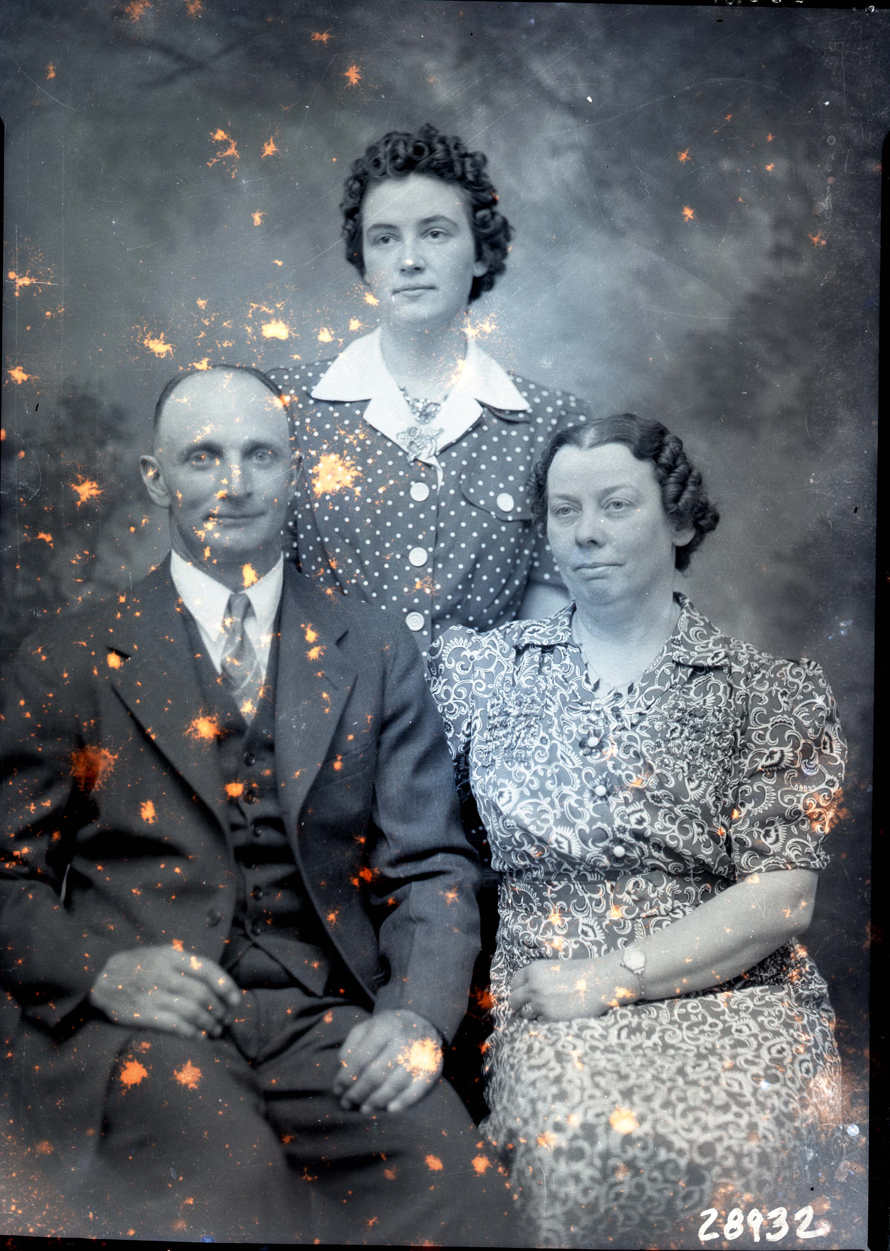 Unidentified older man and woman seated together with a young woman standing behind them.