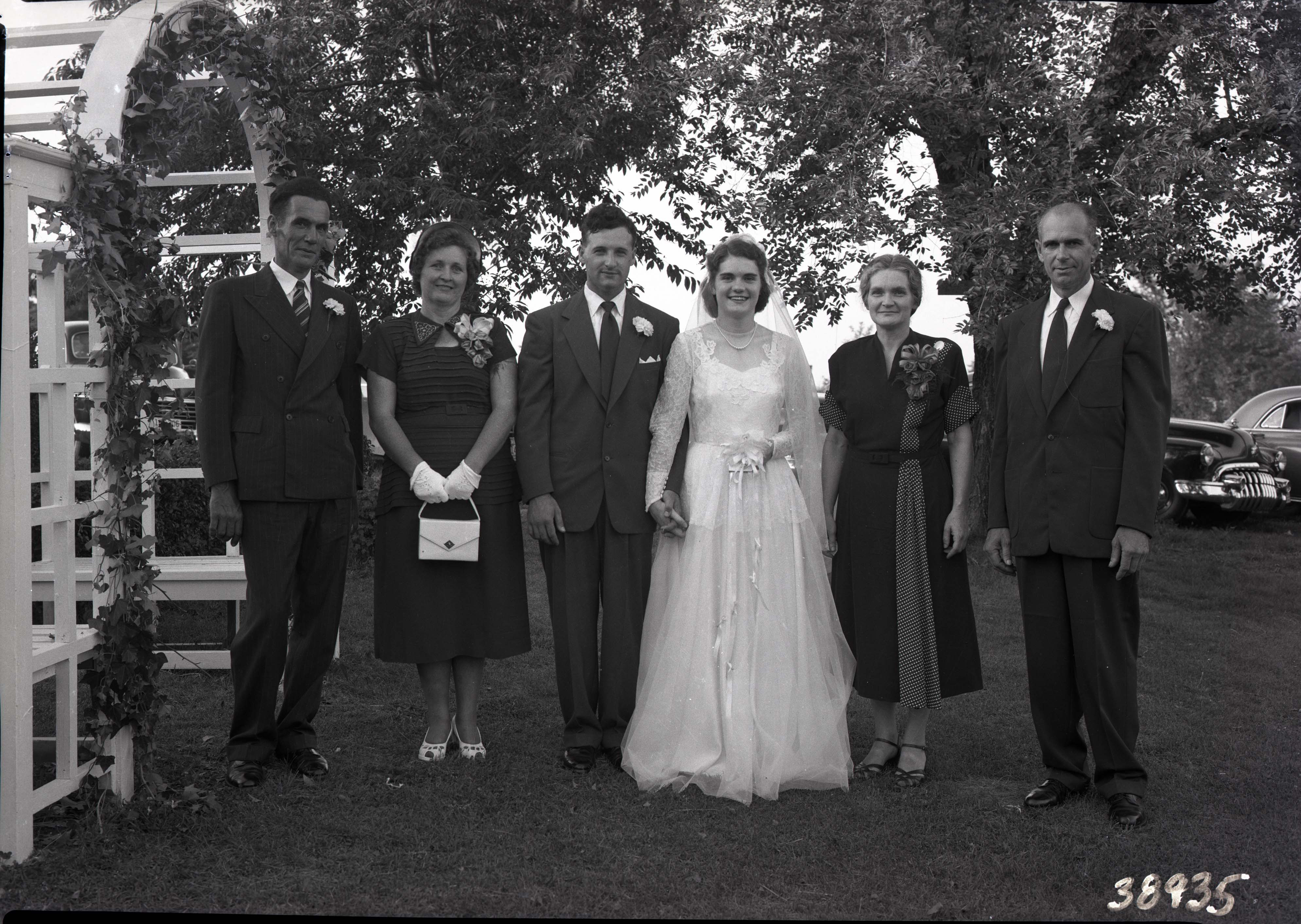 Photograph of an unidentified bride and groom in their wedding attire with both sets of parents on either side.