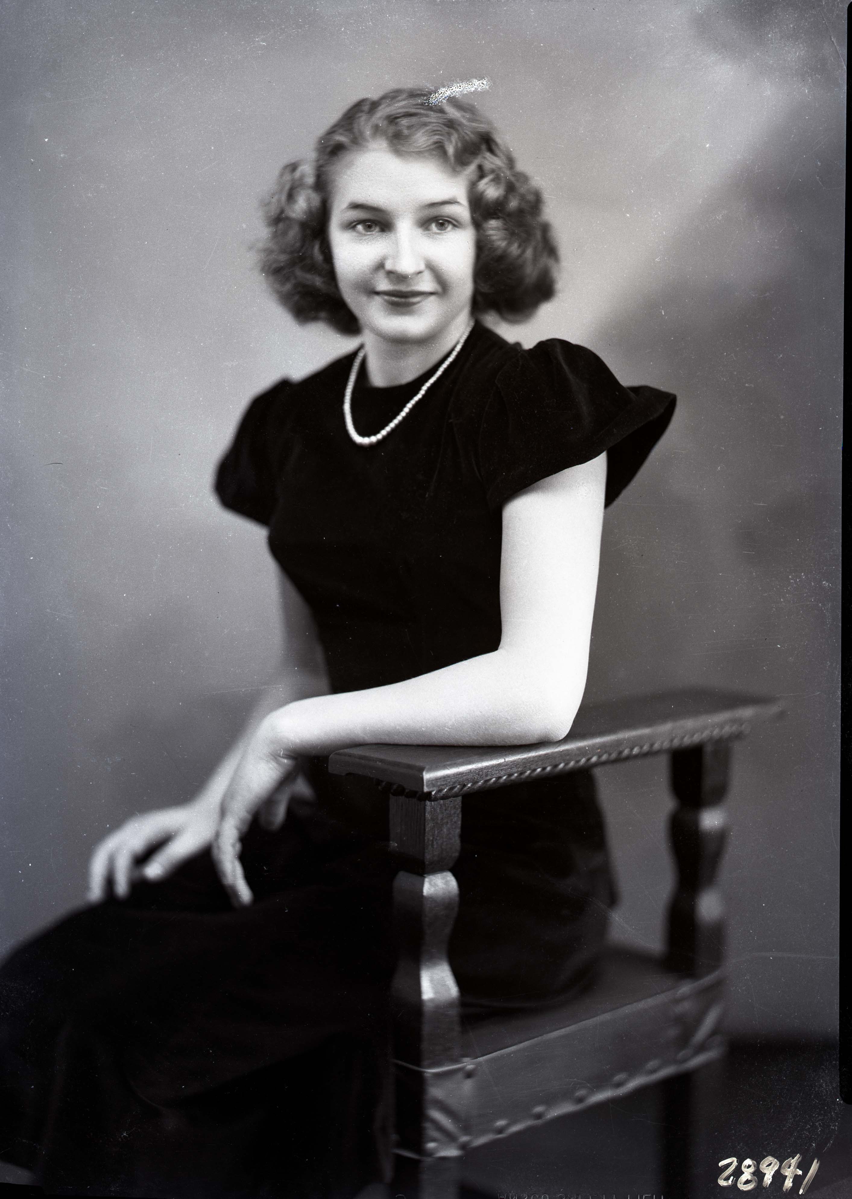 Unidentified woman with short curly hair and wearing a faux pearl necklace with her short-sleeved dress. She is posed, seated, with an elbow resting on the chair's arm.