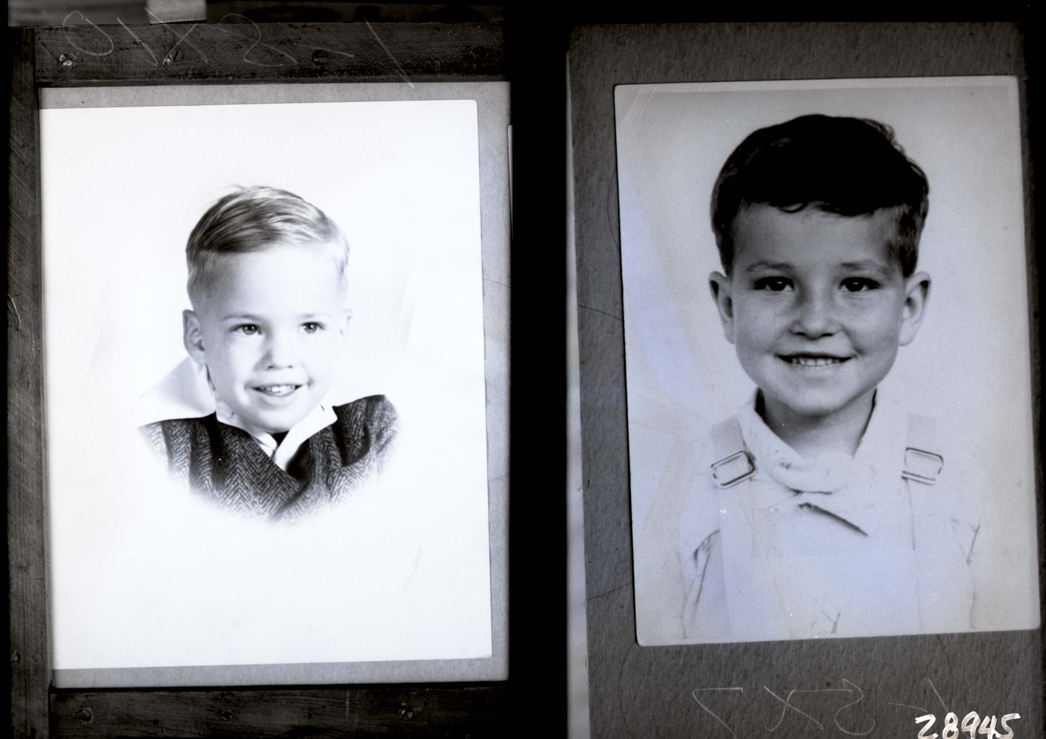 Photo of two separate portrait photographs of different unidentified boys. The one on the left is younger than the one on the right.