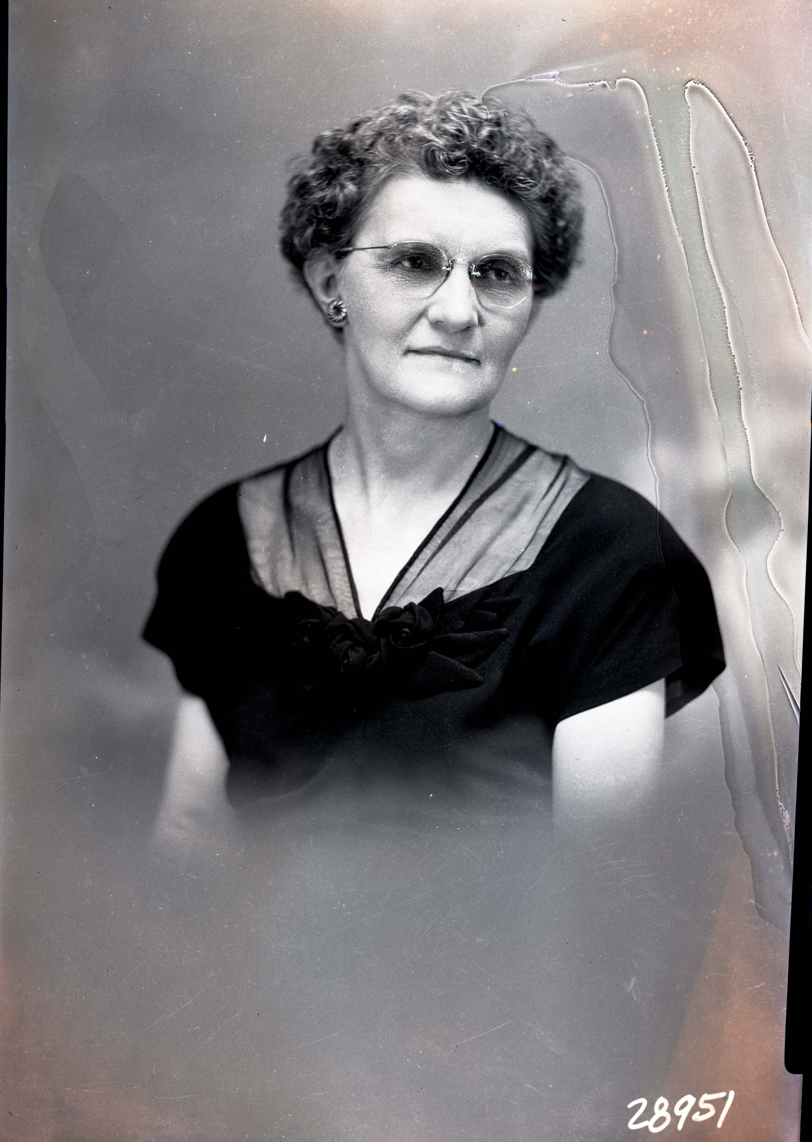Portrait photograph of an unidentified older woman with short hair and glasses. She is wearing earrings with her short-sleeved dress.