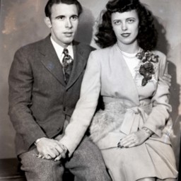 Unidentified young man in a suit is seated with his arm around an unidentified woman with long wavy hair who is wearing a corsage.