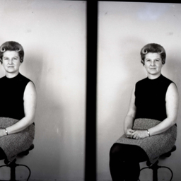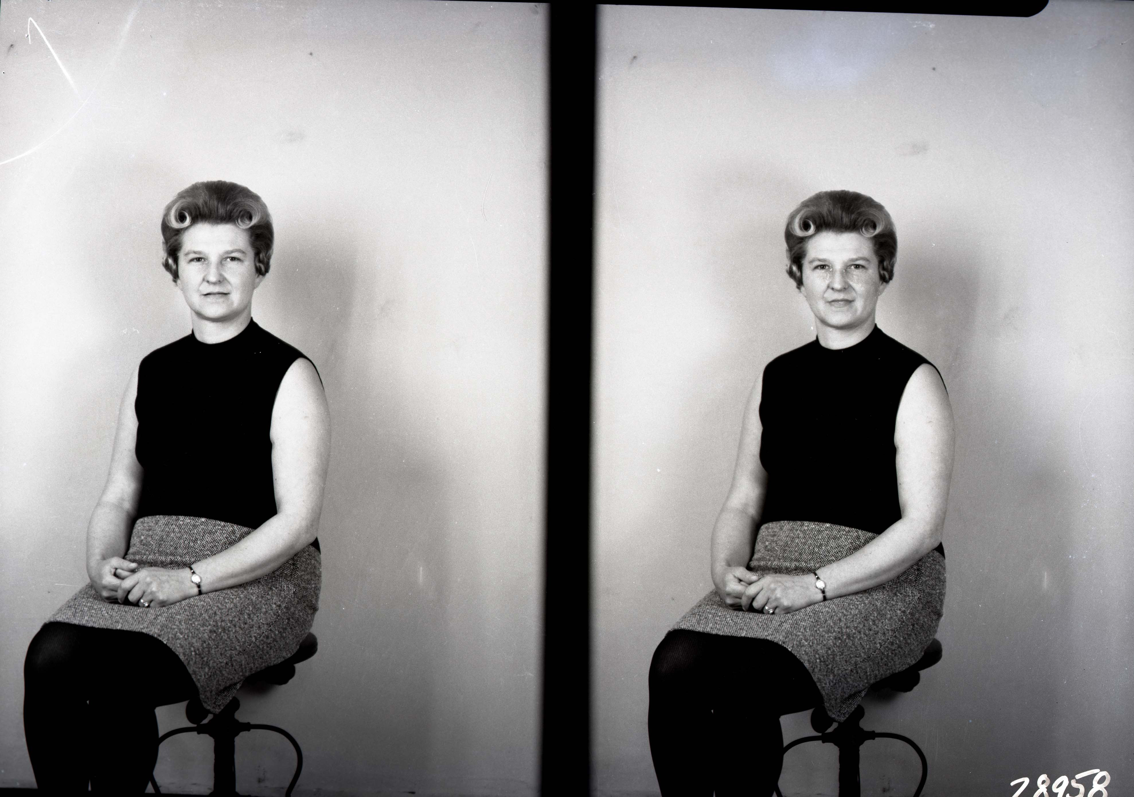 Photo of two separate photographs of the same unidentified woman with short, styled hair seated on a stool and wearing a sleeveless top and skirt.