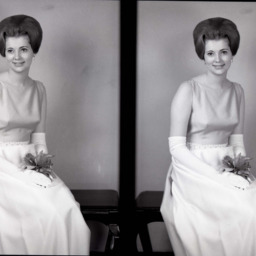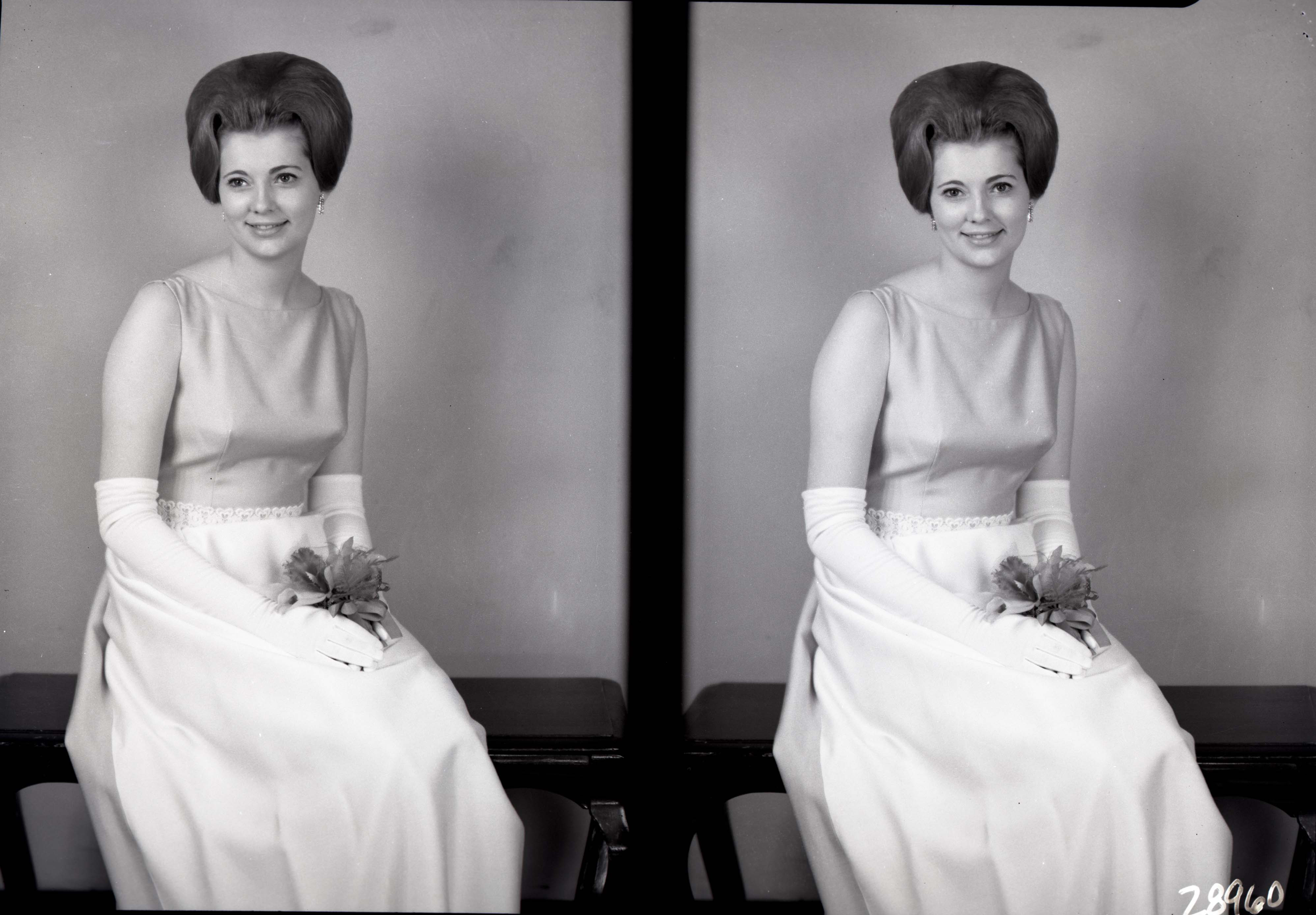 Photo of two separate photographs of the same, unidentified woman wearing a formal dress and long gloves.