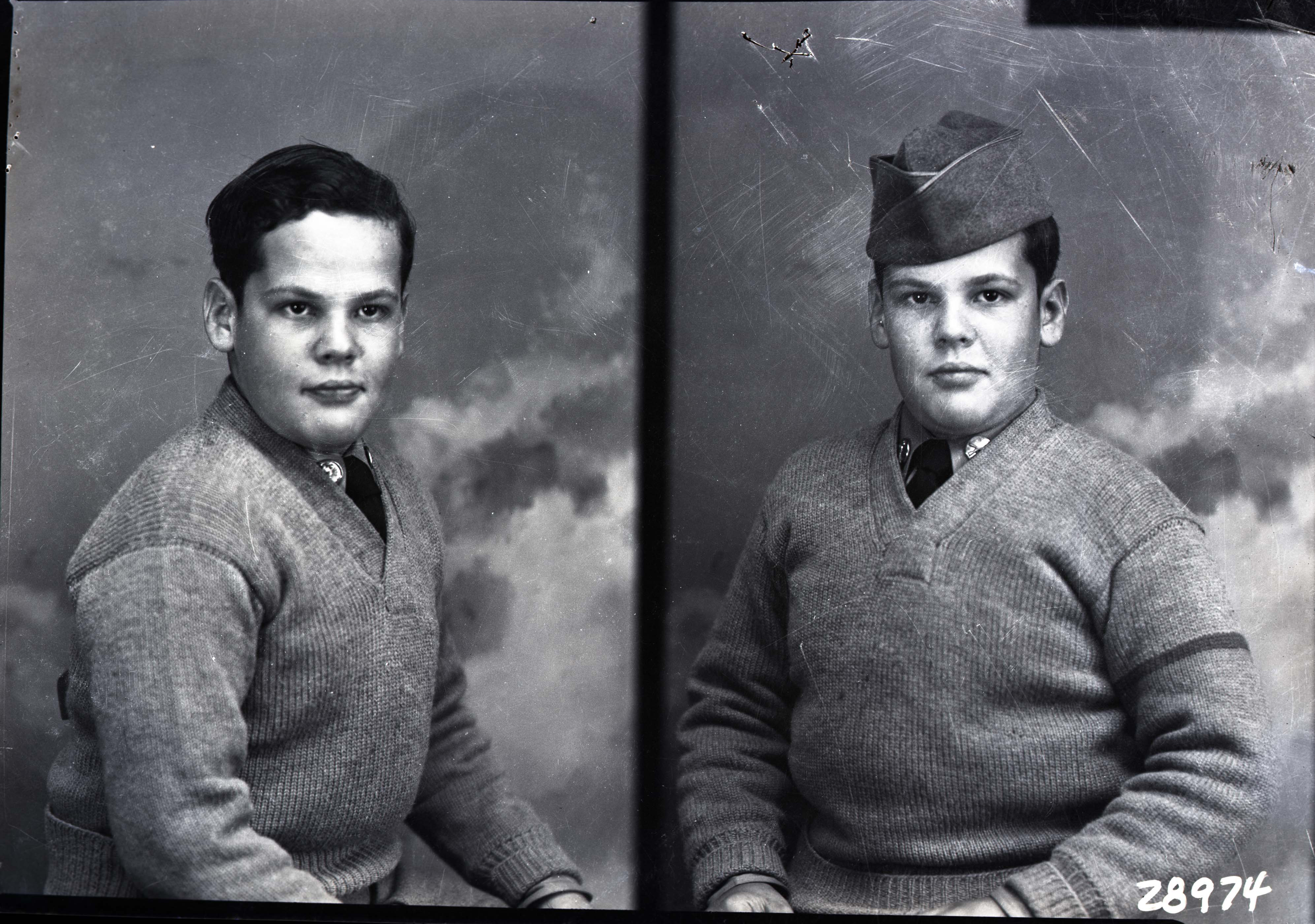 Photo of two separate portrait photographs of the same unidentified cadet from Massanutten Military Academy (MMA) in his school's sweater and cap.