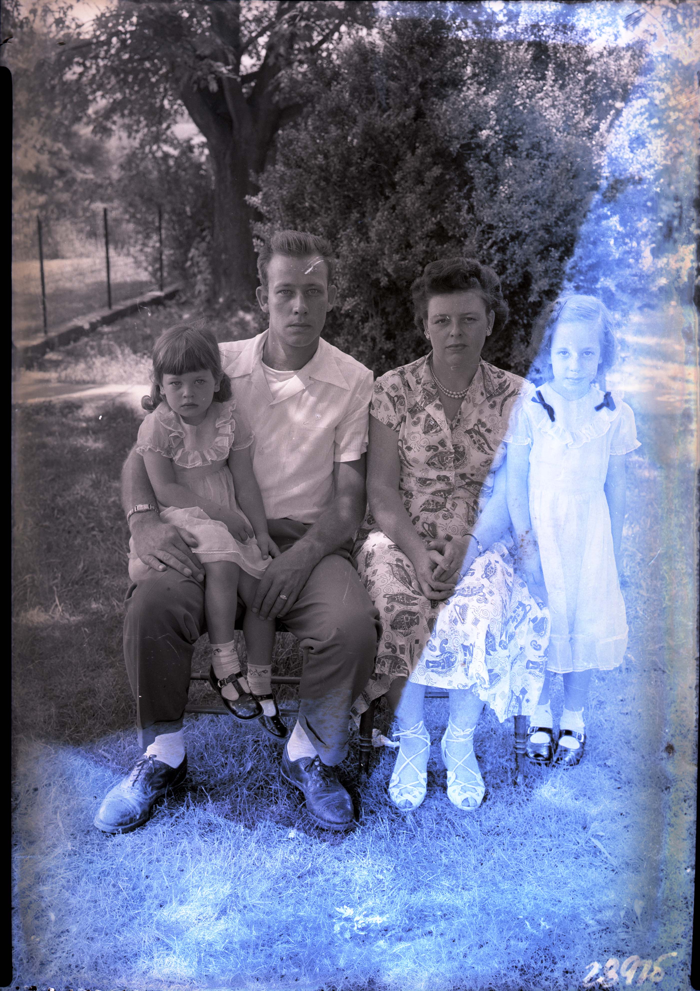 Photograph of Donald J. Dellinger with his wife and two daughters posed under a tree outdoors.