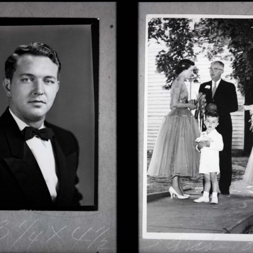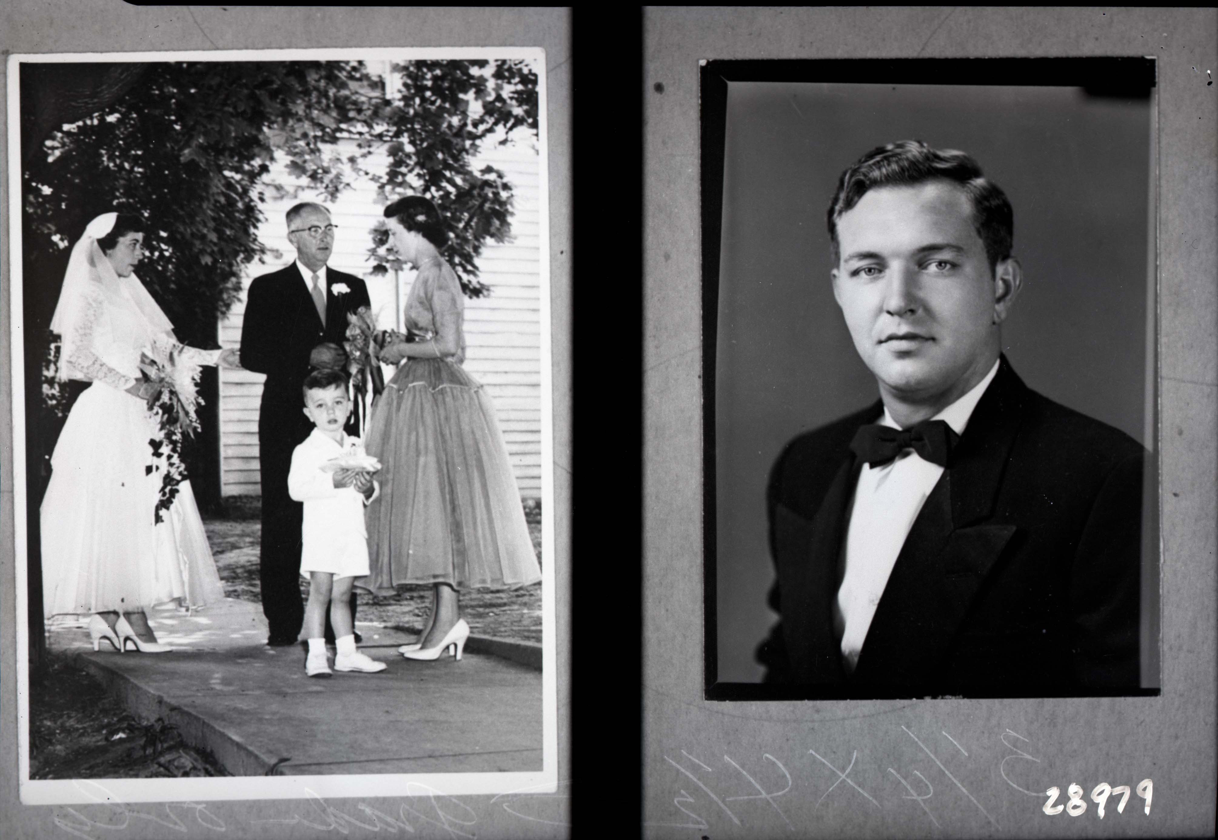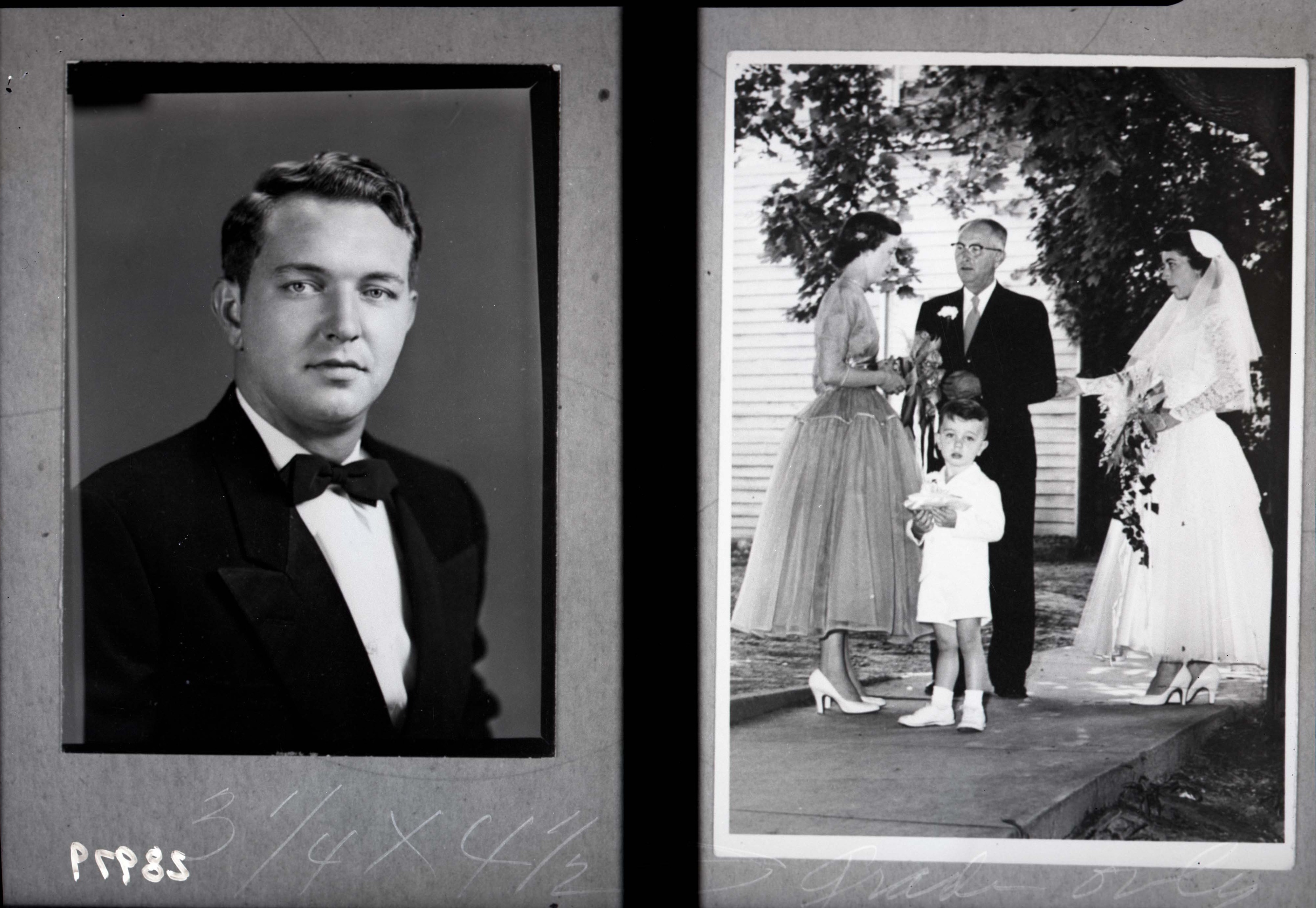 On the right is a portrait photograph of an unidentified young man in formal attire with a bow tie. A note along the bottom says, "3-1/4 X 4-1/4", indicating, perhaps the size of the print the photographer planned to make.
