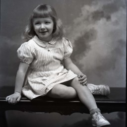 Photograph of an unidentified young girl with bangs and wearing a striped, short-sleeved dress. She is seated on a bench with one leg under the other.