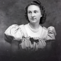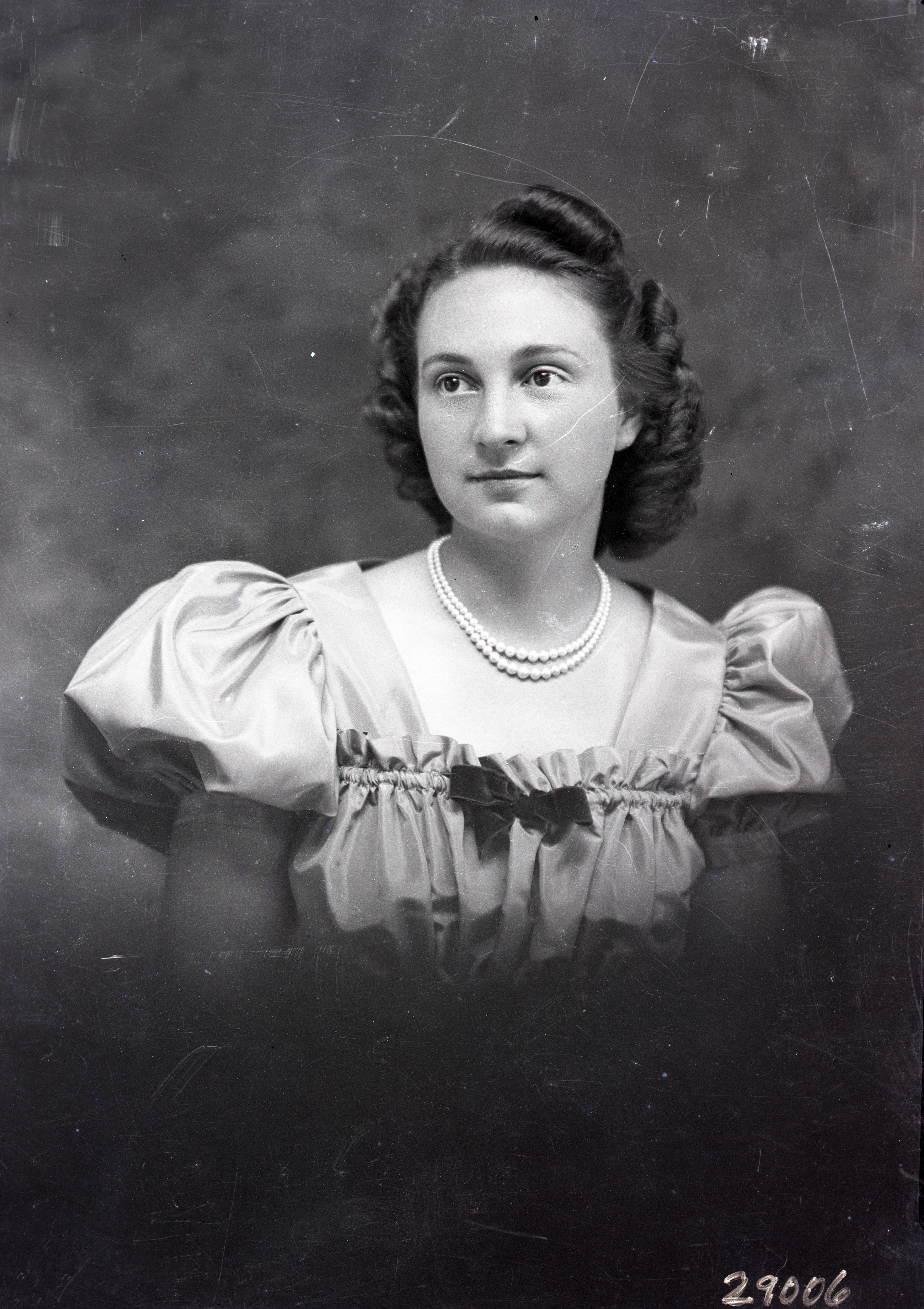 Portrait photograph of an unidentified woman with short, curled hair wearing faux pearls with her short-sleeved dress.