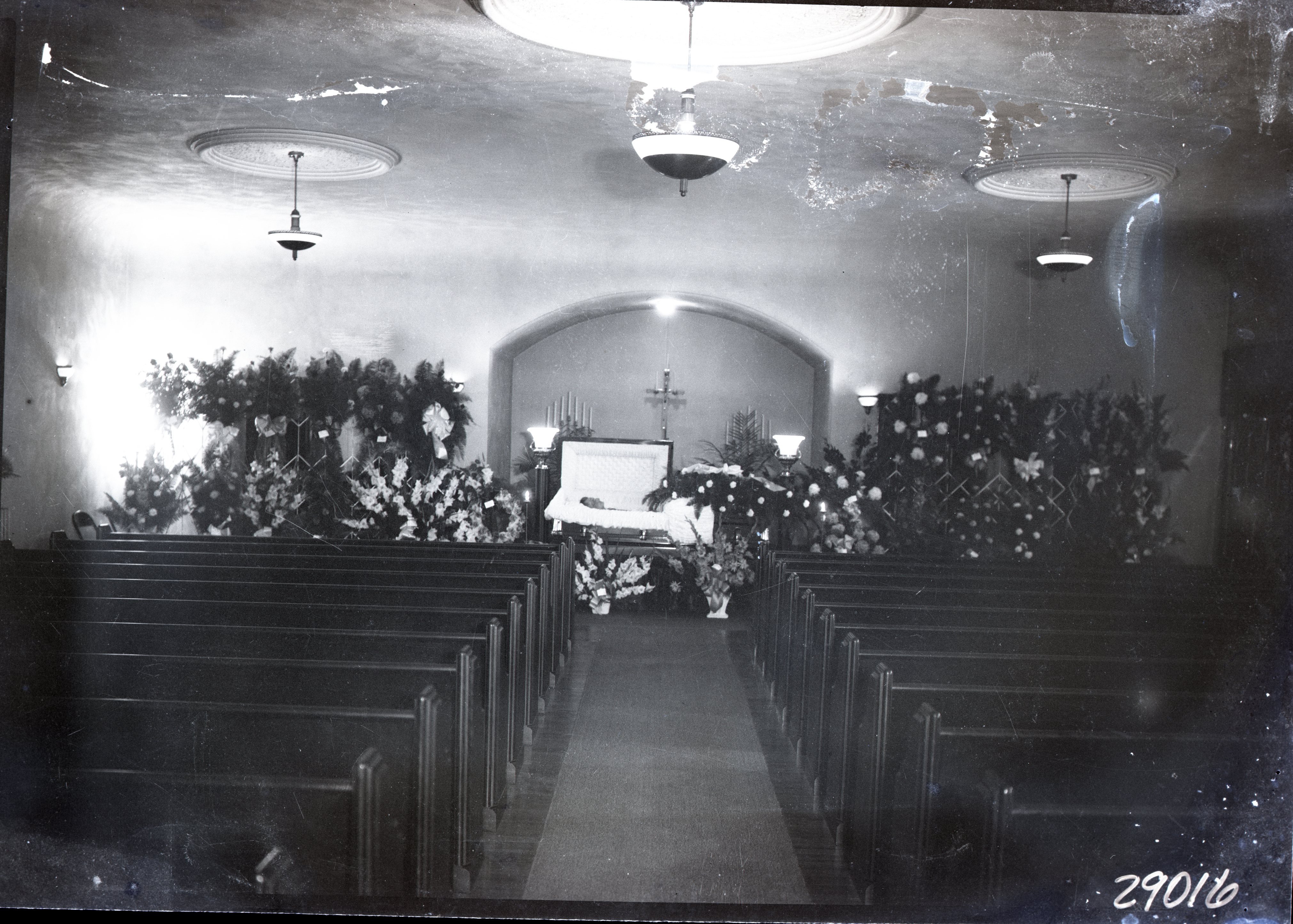 Photograph of the inside of an unidentified church showing rows of empty pews in the foreground and an open casket with a deceased man in it on the altar and surrounded by floral arrangements.