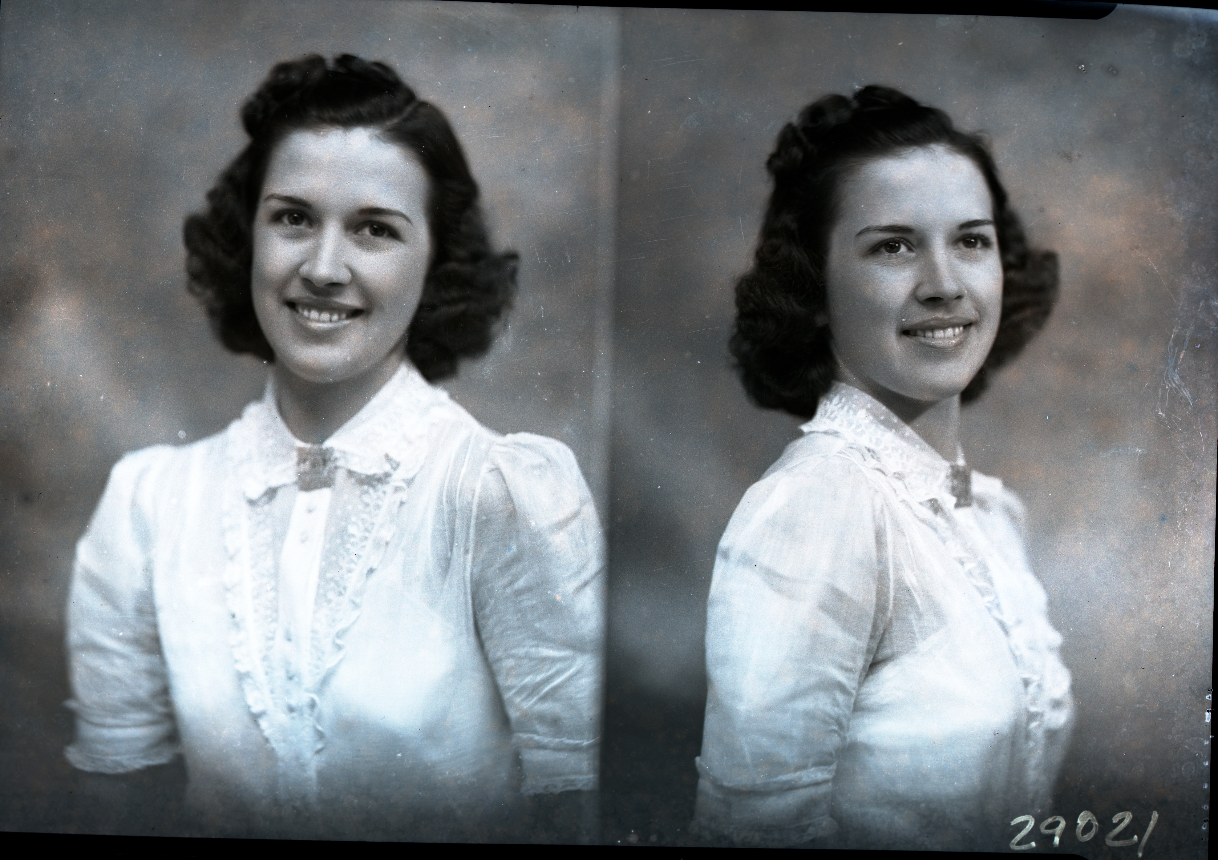 Photo of two separate images of the same unidentified young woman with curly hair and wearing a pin at the neck of her blouse.