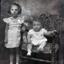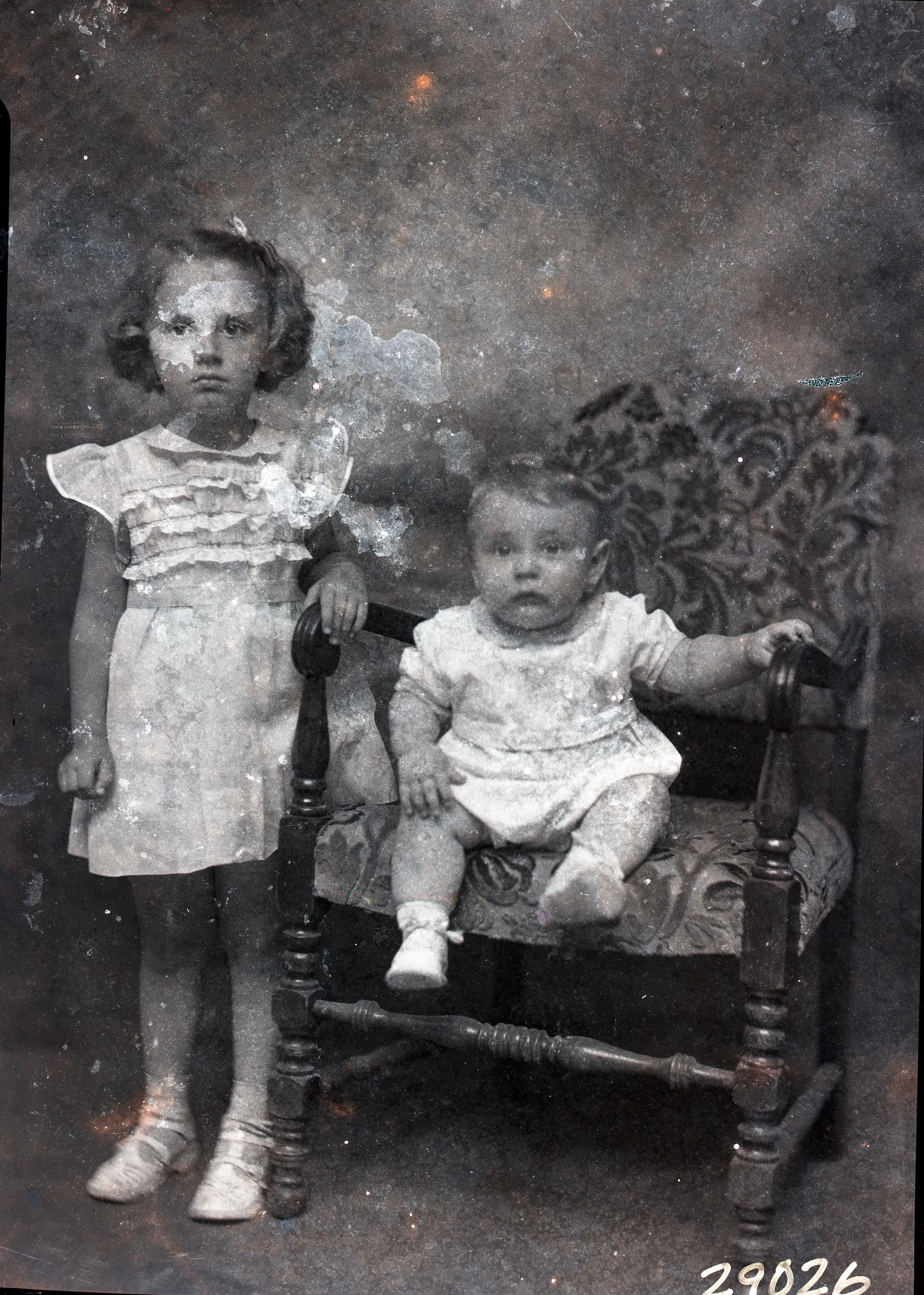 Two unidentified children, a girl with short hair and a younger toddler on a chair, are posed together.