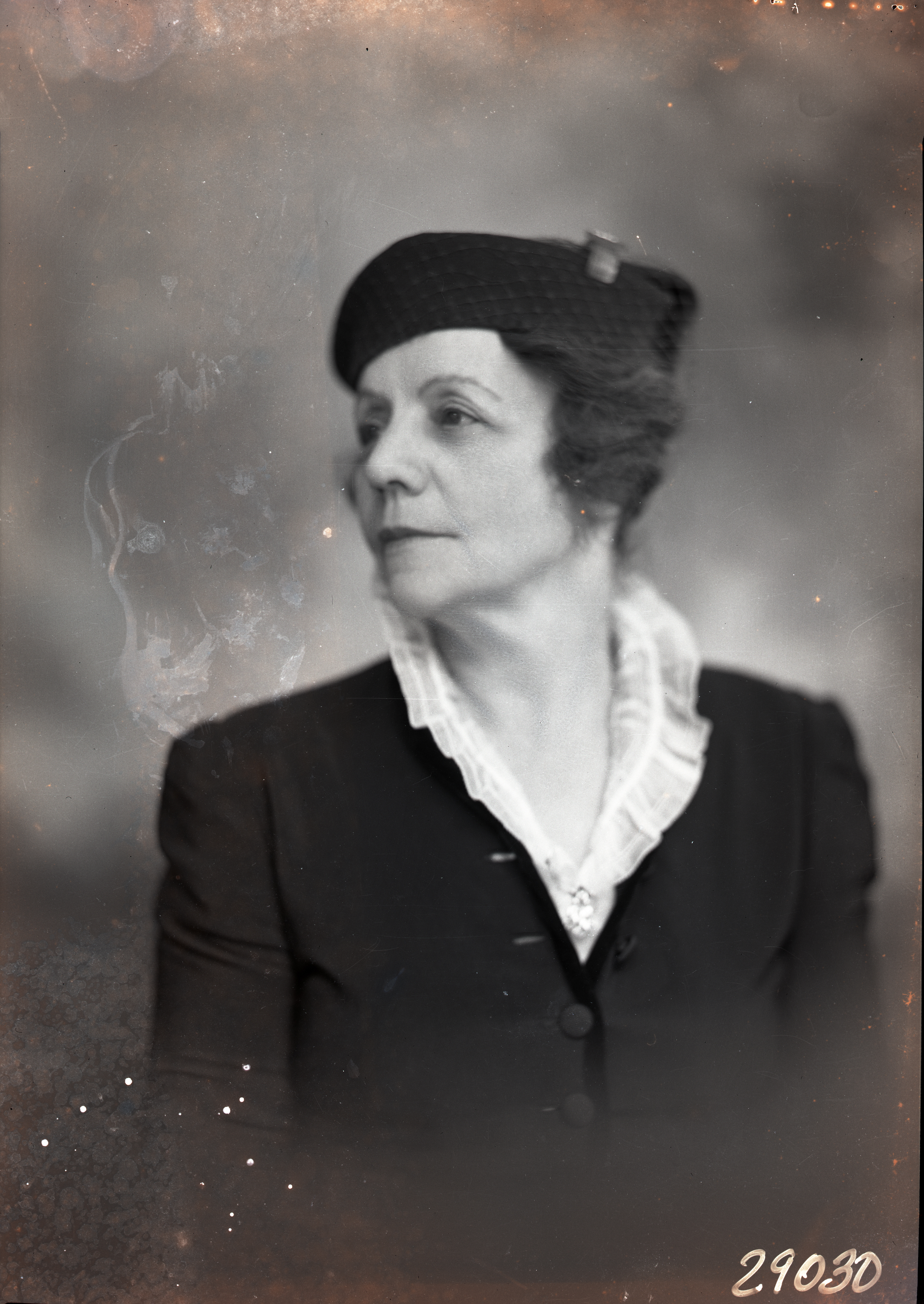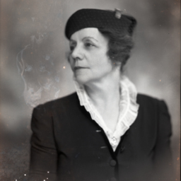 Portrait photograph of an unidentified woman shown almost in profile and wearing a hat,