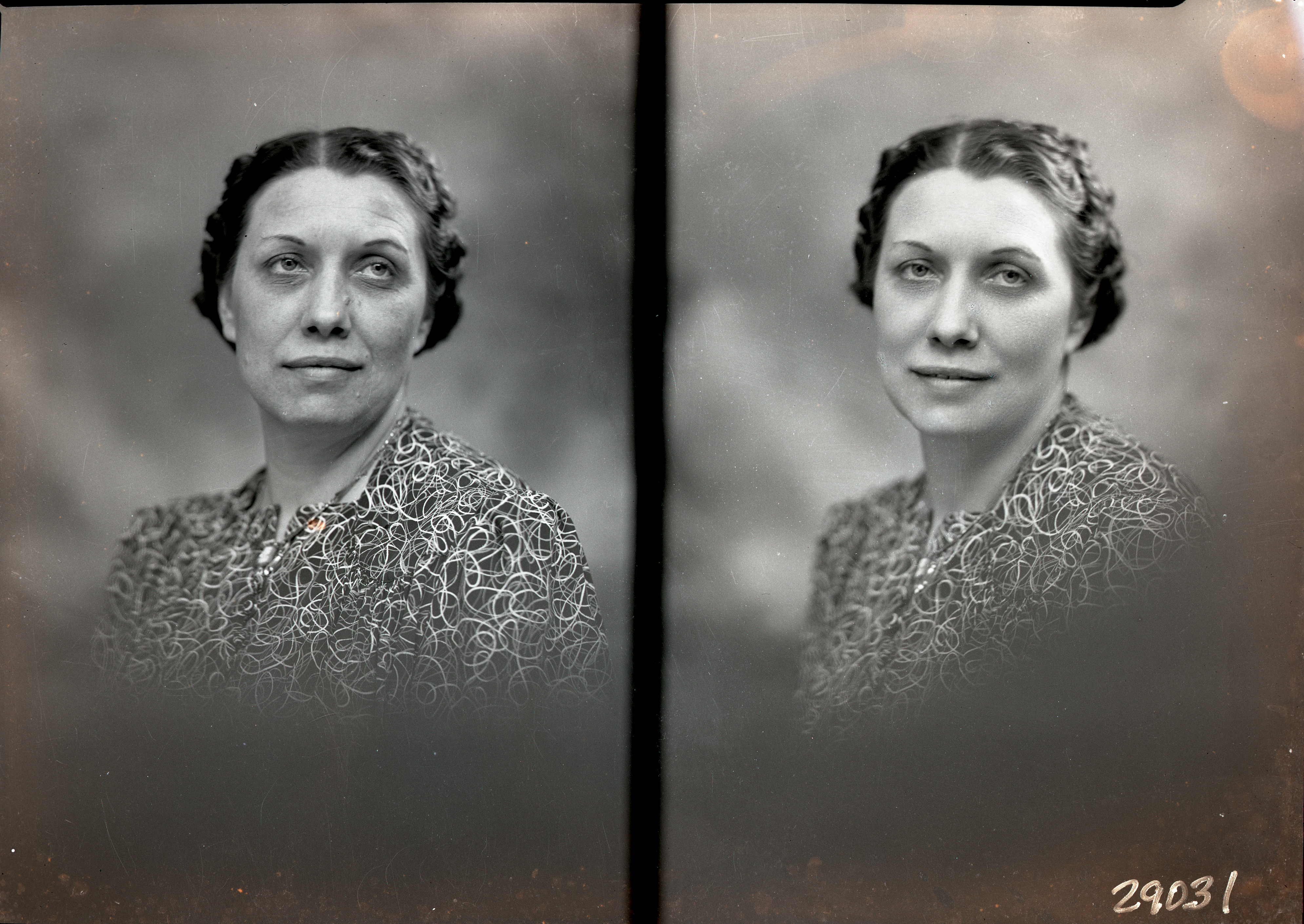 Photo of two separate portrait photographs of the same unidentified woman with her hair pulled back and wearing a print dress.