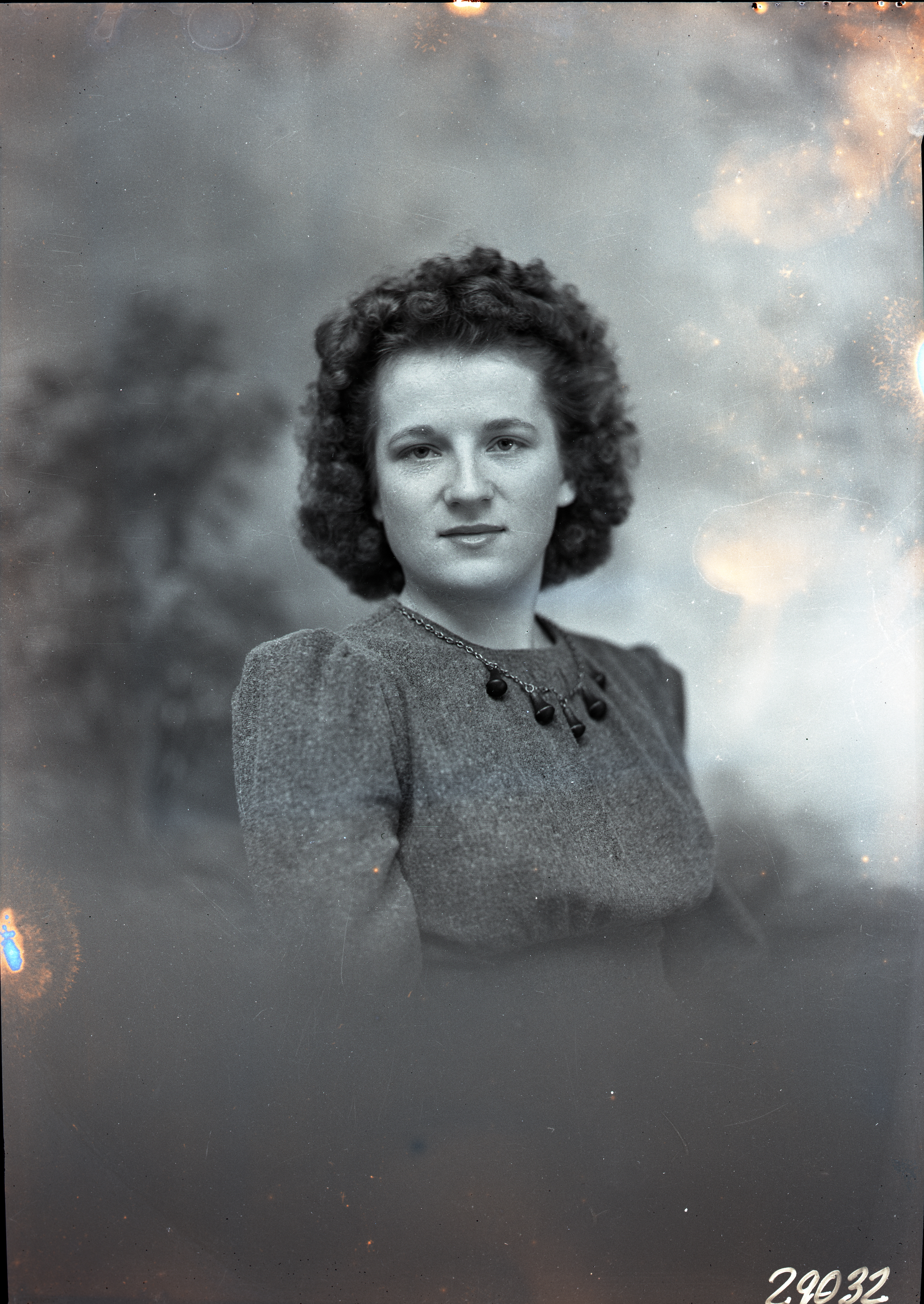 Portrait photograph of an unidentified woman with short, curly hair and wearing a necklace with her dress.