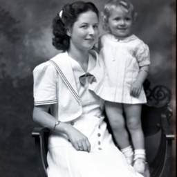 Unidentified woman with short curly hair held with a barrette is seated on a chair next to a young blond child standing beside her.