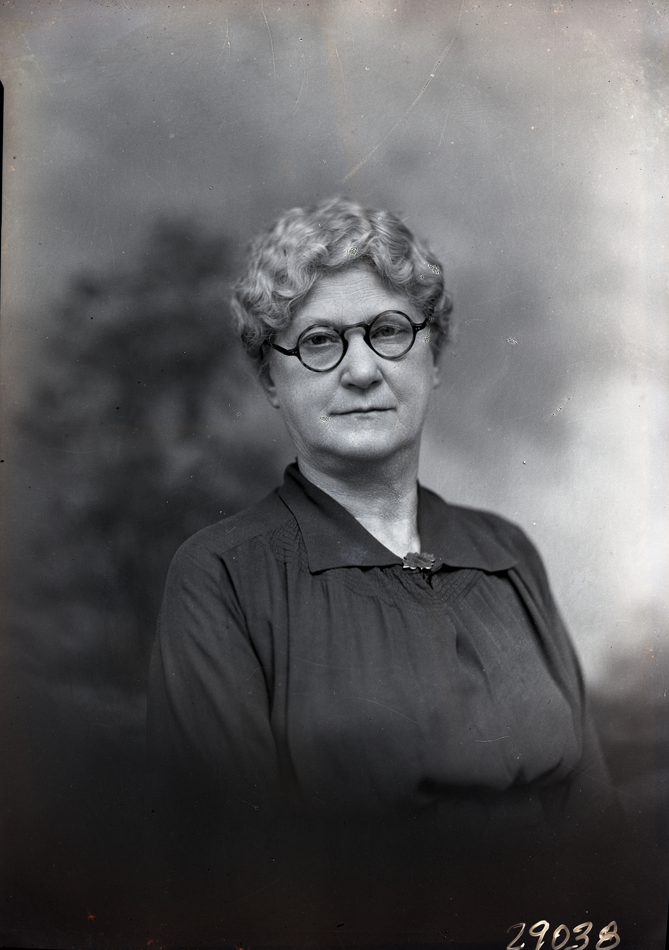 Portrait photograph of an unidentified woman with short curly hair, glasses, and wearing a pin on the front of her dress.