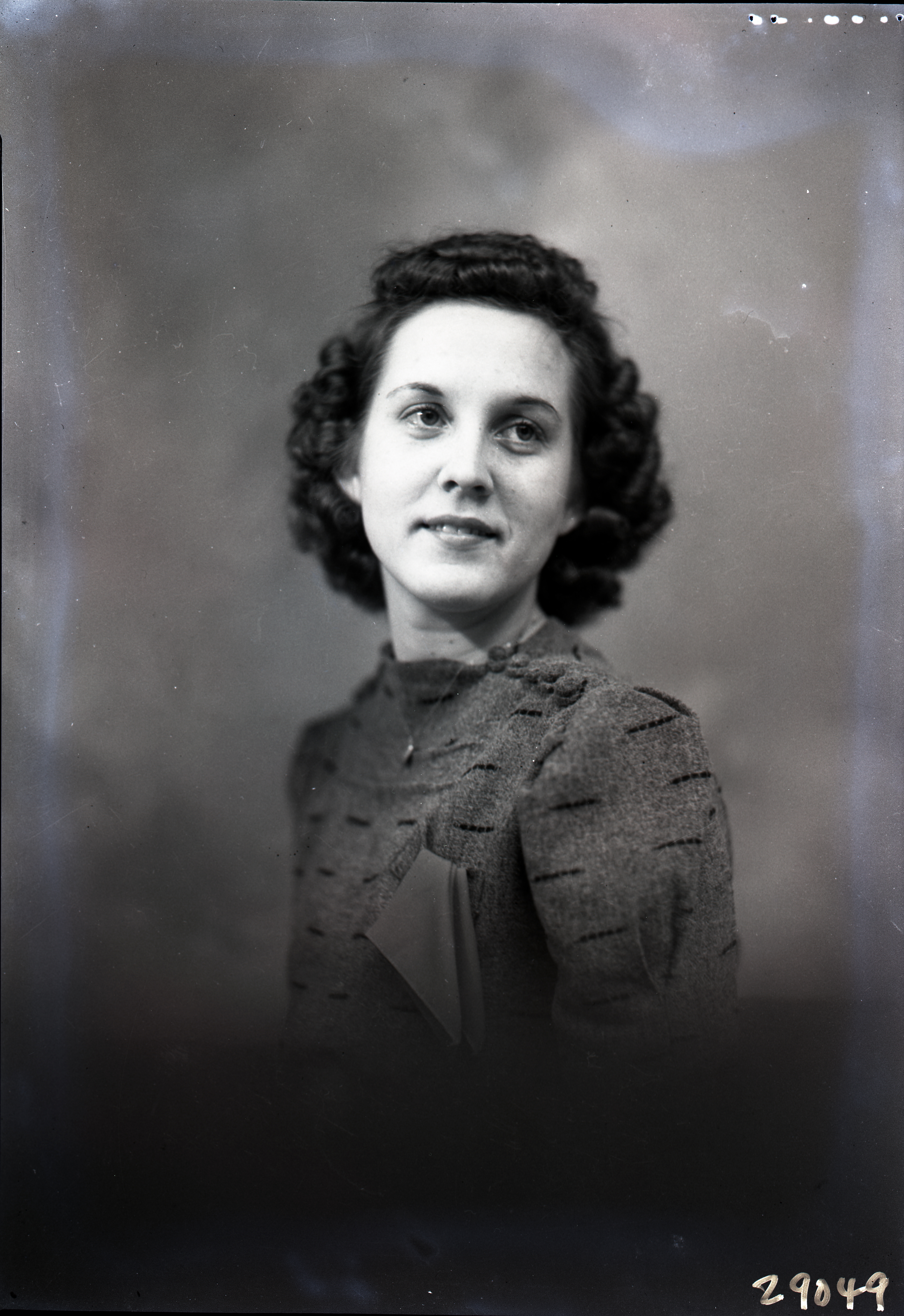 Portrait photograph of an unidentified woman with short curly dark hair and wearing a necklace with her dress.