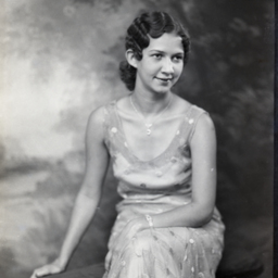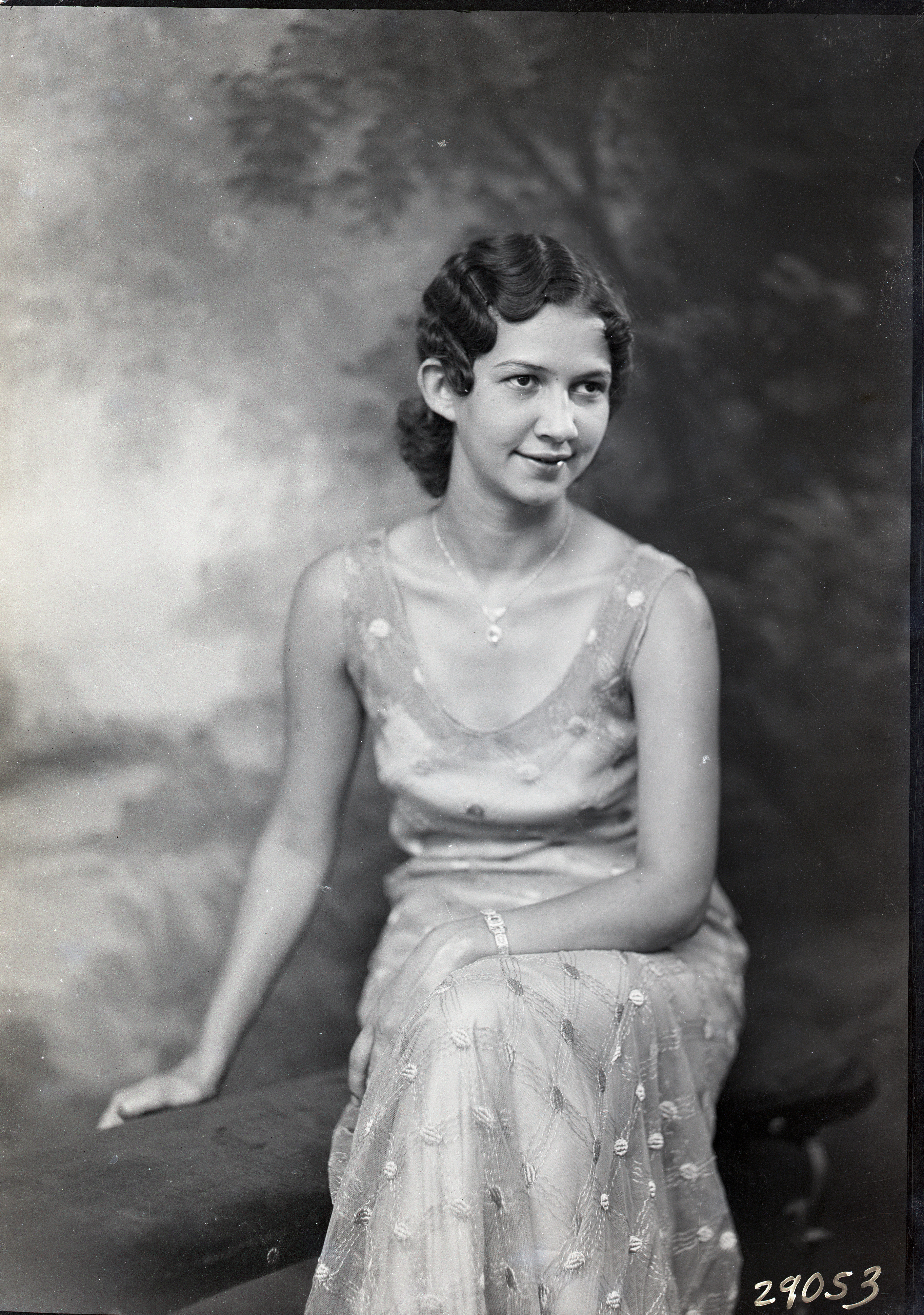 Unidentified young woman with wavy hair pulled back and wearing a necklace with her sleeveless gown. She is seated on a bench.