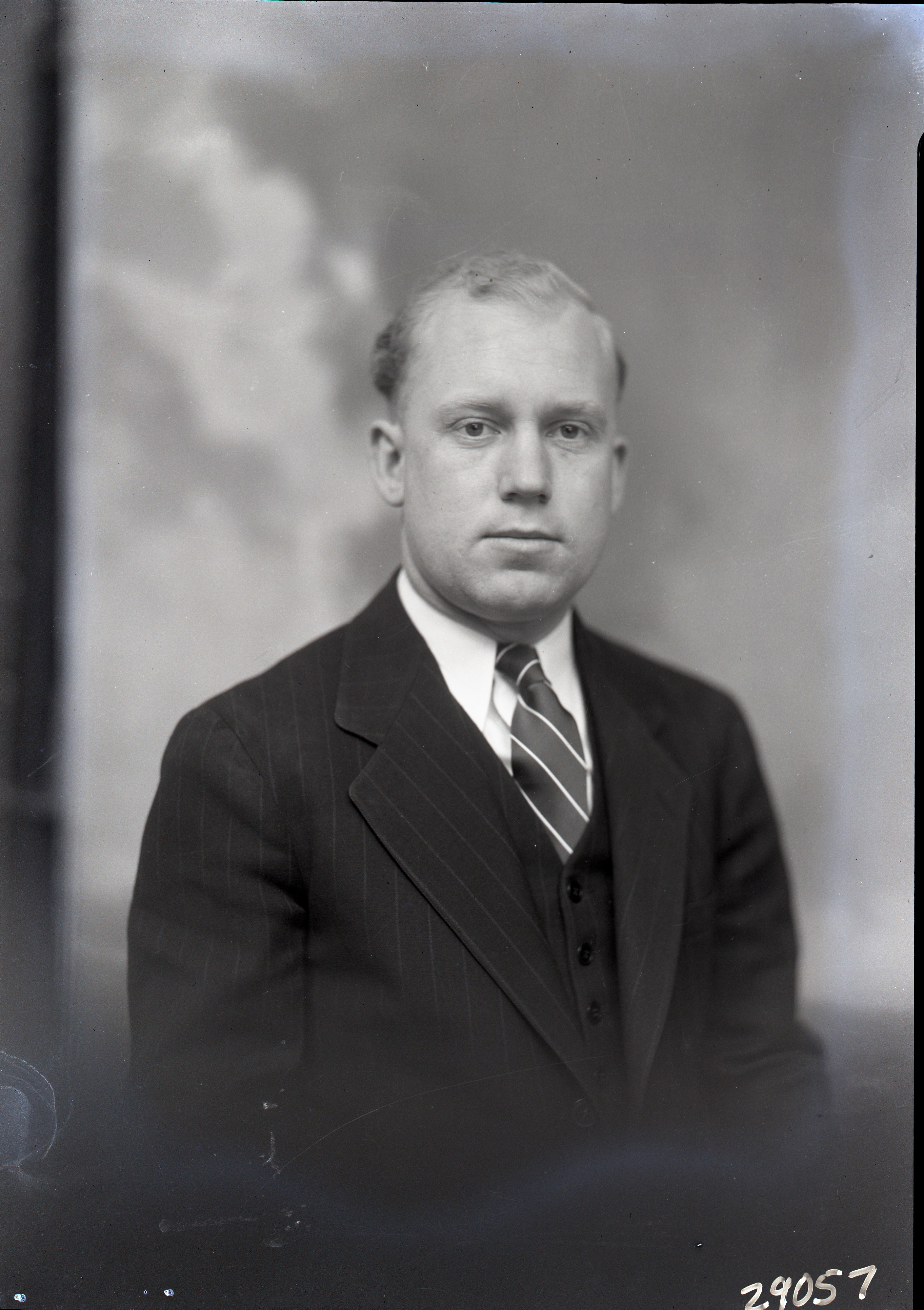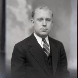 Portrait photograph of an unidentified man wearing a suit and striped tie.