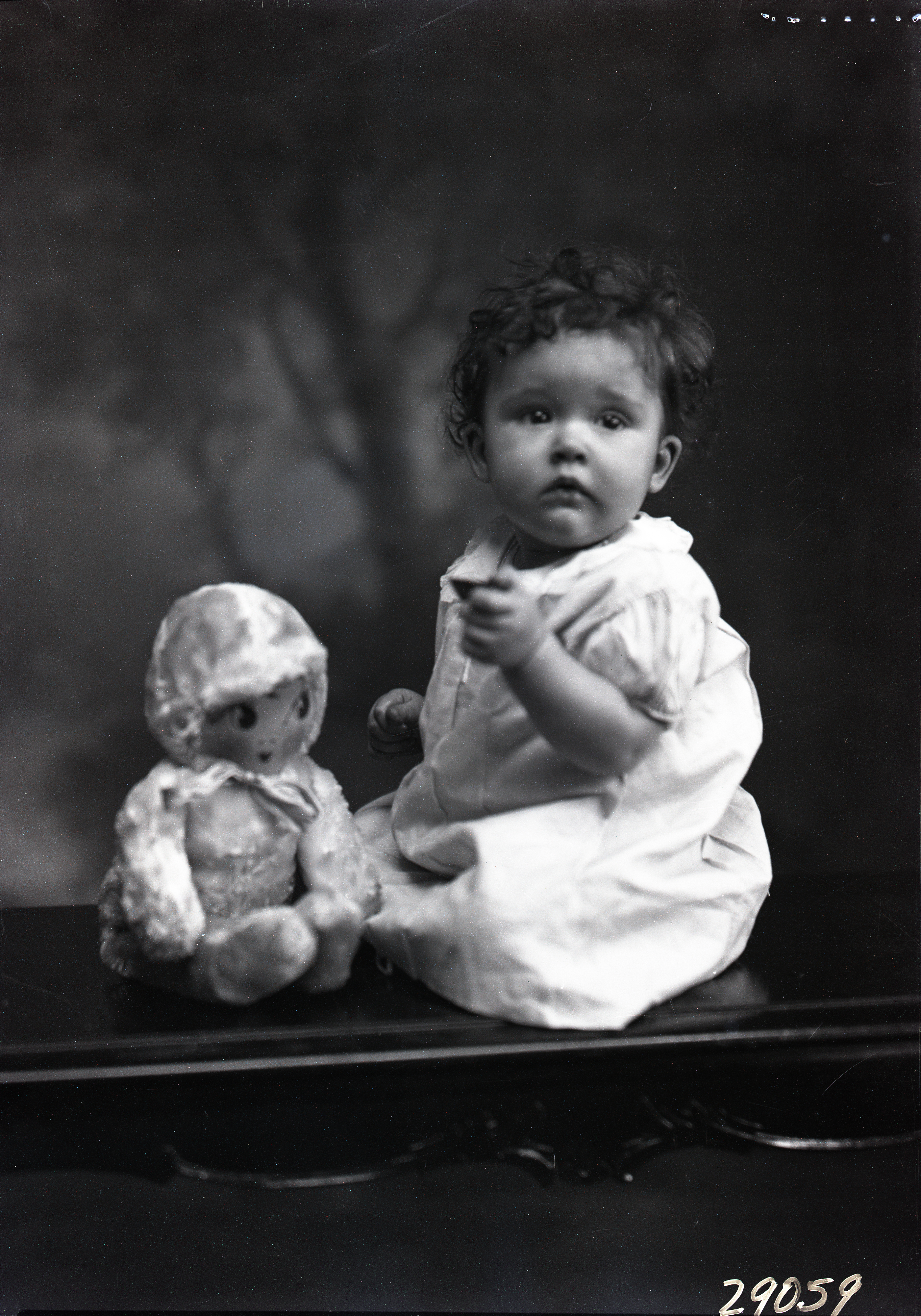 Unidentified young child with dark hair is seated on a bench beside a doll.