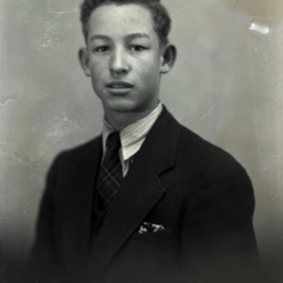 Portrait photograph of an unidentified young man wearing a suit and plaid tie. A print handkerchief is visible sticking out of his breast pocket.
